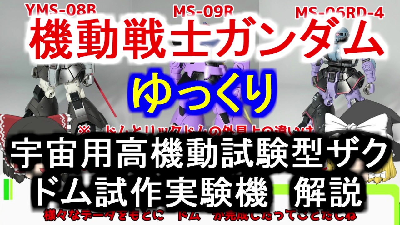 ゆっくり解説動画をご覧頂きありがとうございます<br><br>第52回 ドム試作実験機&宇宙用高機動試験型ザク になりますので温かい目でご覧ください<br><br><span style="color: #333333; font-size: 14px;">前回→</span><a href="https://www.nicovideo.jp/watch/sm35806858" class="watch">sm35806858</a><span style="color: #333333; font-size: 14px;"> 次→</span><a href="https://www.nicovideo.jp/watch/sm35908012" class="watch">sm35908012</a><br><br><span style="color: #333333; font-size: 14px;">マイリスト→</span><span style="color: #006699; font-size: 14px;"><a href="https://www.nicovideo.jp/mylist/57983917" target="_blank" rel="noopener">mylist/57983917</a></span><br><br><span style="color: #000000; font-size: 13px;">∀ガンダム MS解説→</span><a href="https://www.nicovideo.jp/mylist/64941178" target="_blank" rel="noopener">mylist/64941178</a><br><br>Gのレコンギスタ MS解説→<a href="https://www.nicovideo.jp/mylist/64330501" target="_blank" rel="noopener">mylist/64330501</a><br><br>G-SAVIOUR MS解説→<a href="https://www.nicovideo.jp/mylist/59454744" target="_blank" rel="noopener">mylist/59454744</a><br><br>機動戦士クロスボーンガンダム MS解説→<a href="https://www.nicovideo.jp/mylist/62932906" target="_blank" rel="noopener">mylist/62932906</a><br><br>機動戦士Vガンダム MS解説→<a href="https://www.nicovideo.jp/mylist/63385535" target="_blank" rel="noopener">mylist/63385535</a> <br><br>機動戦士ガンダムF91 MS解説→<a href="https://www.nicovideo.jp/mylist/61812408" target="_blank" rel="noopener">mylist/61812408</a> <br><br>今まで投稿した動画→<a href="https://www.nicovideo.jp/mylist/28583653" target="_blank" rel="noopener">mylist/28583653</a><br><br>youtubeチャンネル<br>シュウ部屋ちゃんねる で検索!<br><br>沢山の宣伝有難う御座います。宣伝者様一覧 <a href="https://ch.nicovideo.jp/article/ar1835247" target="_blank" rel="noopener">ar1835247</a>