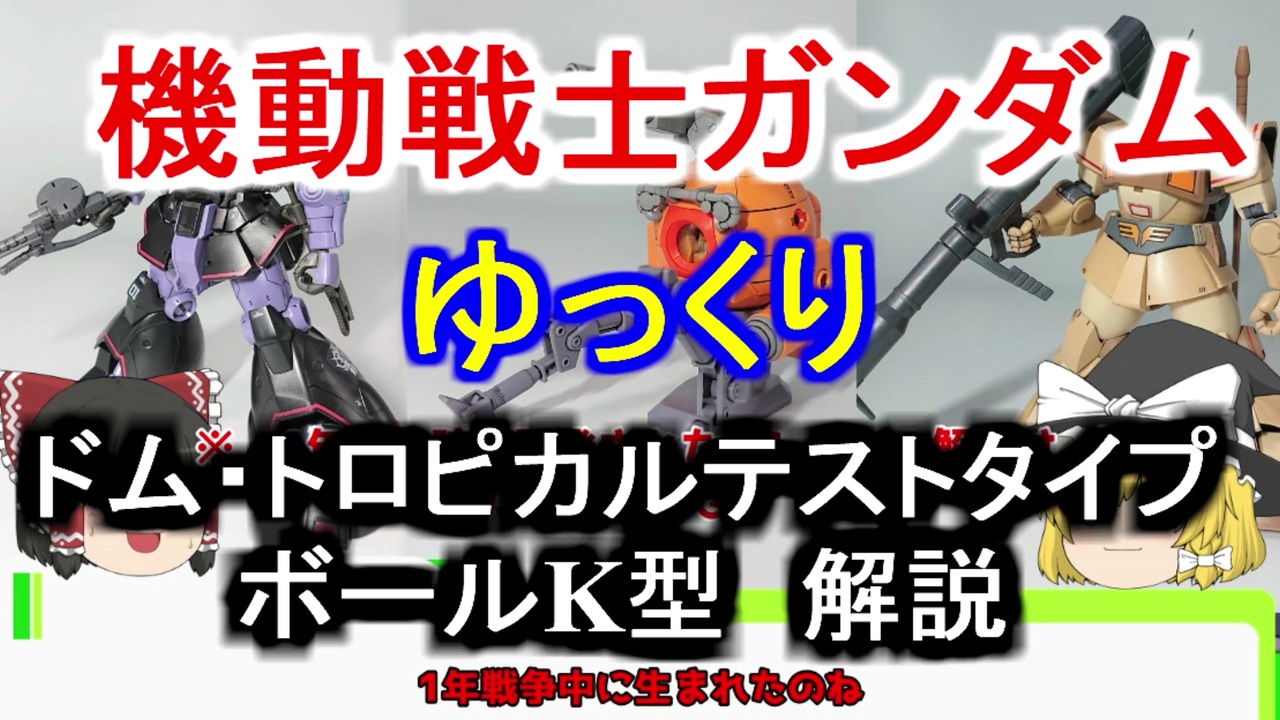 ゆっくり解説動画をご覧頂きありがとうございます<br><br>第53回 ドム・トロピカルテストタイプ&ボールK型 になりますので温かい目でご覧ください<br><br><span style="color: #333333; font-size: 14px;">前回→</span><a href="https://www.nicovideo.jp/watch/sm35907939" class="watch">sm35907939</a><span style="color: #333333; font-size: 14px;"> 次→</span><a href="https://www.nicovideo.jp/watch/sm36020418" class="watch">sm36020418</a><br><br><span style="color: #333333; font-size: 14px;">マイリスト→</span><span style="color: #006699; font-size: 14px;"><a href="https://www.nicovideo.jp/mylist/57983917" target="_blank" rel="noopener">mylist/57983917</a></span><br><br><span style="color: #000000; font-size: 13px;">∀ガンダム MS解説→</span><a href="https://www.nicovideo.jp/mylist/64941178" target="_blank" rel="noopener">mylist/64941178</a><br><br>Gのレコンギスタ MS解説→<a href="https://www.nicovideo.jp/mylist/64330501" target="_blank" rel="noopener">mylist/64330501</a><br><br>G-SAVIOUR MS解説→<a href="https://www.nicovideo.jp/mylist/59454744" target="_blank" rel="noopener">mylist/59454744</a><br><br>機動戦士クロスボーンガンダム MS解説→<a href="https://www.nicovideo.jp/mylist/62932906" target="_blank" rel="noopener">mylist/62932906</a><br><br>機動戦士Vガンダム MS解説→<a href="https://www.nicovideo.jp/mylist/63385535" target="_blank" rel="noopener">mylist/63385535</a> <br><br>機動戦士ガンダムF91 MS解説→<a href="https://www.nicovideo.jp/mylist/61812408" target="_blank" rel="noopener">mylist/61812408</a> <br><br>今まで投稿した動画→<a href="https://www.nicovideo.jp/mylist/28583653" target="_blank" rel="noopener">mylist/28583653</a><br><br>youtubeチャンネル<br>シュウ部屋ちゃんねる で検索!<br><br><span style="color: #000000; font-size: 14px;">沢山の宣伝有難う御座います。宣伝者様一覧 </span><a href="https://ch.nicovideo.jp/article/ar1840097" target="_blank" rel="noopener">ar1840097</a>