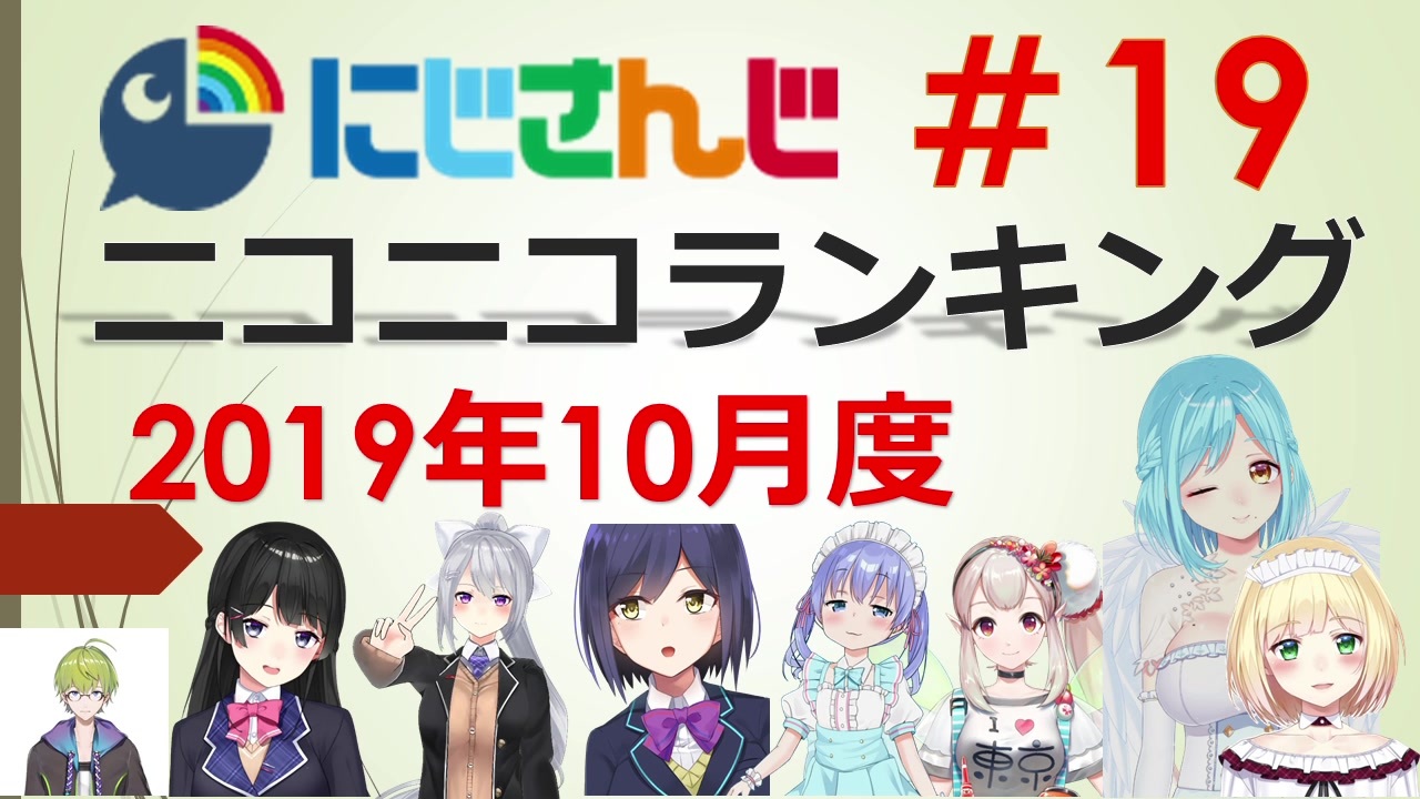 ■集計期間:2019年<span style="color: #ff0000; font-size: 18px;">10月1日</span><span style="color: #262626; font-size: 13px;">0時</span><span style="color: #262626; font-size: 16px;">~</span><span style="color: #ff0000; font-size: 18px;">10月31日</span><span style="font-size: 13px;">24時</span><br>■集計方法:再生数+(コメント数×補正値)+(マイリスト登録数×<span style="color: #ff0000;">25</span><span style="color: #262626;">)</span><br>■集計対象:タグ 「にじさんじ」がついている動画<br>──────<br>プレイリスト:<a href="https://www.nicovideo.jp/mylist/66857238" target="_blank" rel="noopener">mylist/66857238</a><br>──────<br><span style="color: #000000; font-size: 13px;">#18(9月度):</span><a href="https://www.nicovideo.jp/watch/sm35793304" class="watch">sm35793304</a><span style="color: #000000; font-size: 13px;"> | #19(10月度):いまここ|<br>#20(11月度):12月上旬ごろ | </span><br>──────<span style="color: #000000; font-size: 13px;"> </span><br><br>2019年10月度のランキングです。<br>このランキングでは<span style="color: #ff0000;"><u>「にじさんじ」のタグが付いている動画のみ</u></span><span style="color: #ff0000;">が集計対象となっています</span>。<br><br>前回から30位~21位は、動画紹介時間を20秒から15秒と変更しています。<br><br>【宣伝】<br>プレミア公開動画まとめの動画も投稿しています<br>プレミア公開って意外と見逃していますよ!<br>↓↓<br><span style="color: #001835;"><strong>にじさんじプレミア公開動画まとめ #02 2019年10月度</strong></span><br><a href="https://www.nicovideo.jp/watch/sm35895571" class="watch">sm35895571</a>