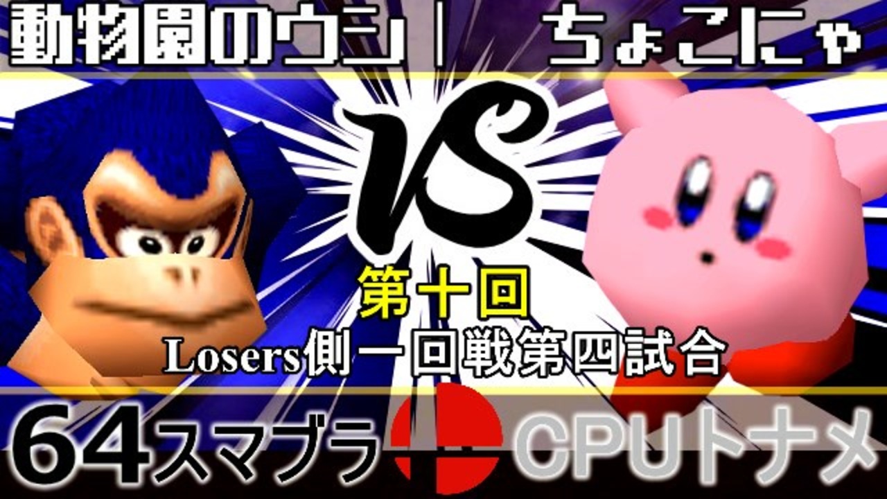 遺伝子組み換え黒毛和牛 vs ドジっ娘アイドル<br>※どちらが勝つかアンケ結果(Twitter調べ) <br>動物園のウシ(DK) 72% VS ちょこにゃ(KI) 28%<br><br><span style="color: #0000ff; font-size: 13px;"><u>※64スマブラCPUトナメ実況wiki</u></span><span style="color: #0000ff; font-size: 13px;">→</span> <a href="https://wiki3.jp/64cpu_P" target="_blank" rel="noopener nofollow">https://wiki3.jp/64cpu_P</a><br><br><span style="color: #ff0000; font-size: 24px;"><strong>次→</strong></span>【<a href="https://www.nicovideo.jp/watch/sm35925046" class="watch">sm35925046</a>】※毎日投稿<br><br>前【<a href="https://www.nicovideo.jp/watch/sm35916273" class="watch">sm35916273</a>】 Winners一回戦第一試合【<a href="https://www.nicovideo.jp/watch/sm35872182" class="watch">sm35872182</a>】 <span style="color: #000000; font-size: 13px;">予選</span>Aブロック第一試合【<a href="https://www.nicovideo.jp/watch/sm35254266" class="watch">sm35254266</a>】 <br><span style="font-size: 14px;">第十回選手紹介動画【</span><span style="color: #006699; font-size: 14px;"><a href="https://www.nicovideo.jp/watch/sm35240933" class="watch">sm35240933</a></span><span style="font-size: 14px;">】</span><br>第十回マイリスト【<a href="https://www.nicovideo.jp/mylist/65788927" target="_blank" rel="noopener">mylist/65788927</a>】<br>64スマブラCPUトナメ実況part1まとめ【<a href="https://www.nicovideo.jp/mylist/60846861" target="_blank" rel="noopener">mylist/60846861</a>】<br>その他シリーズ【<a href="https://www.nicovideo.jp/mylist/12965027" target="_blank" rel="noopener">mylist/12965027</a>】<br><br><span style="color: #00bfff; font-size: 13px;"><strong>Twitter</strong></span>【<a href="https://twitter.com/niconicopppppp" target="_blank" rel="noopener nofollow">https://twitter.com/niconicopppppp</a> 】<br><span style="color: #ff4500; font-size: 13px;"><strong>チャンネル</strong></span>【<a href="https://ch.nicovideo.jp/p-desu" target="_blank" rel="noopener">ch.nicovideo.jp/p-desu</a>】