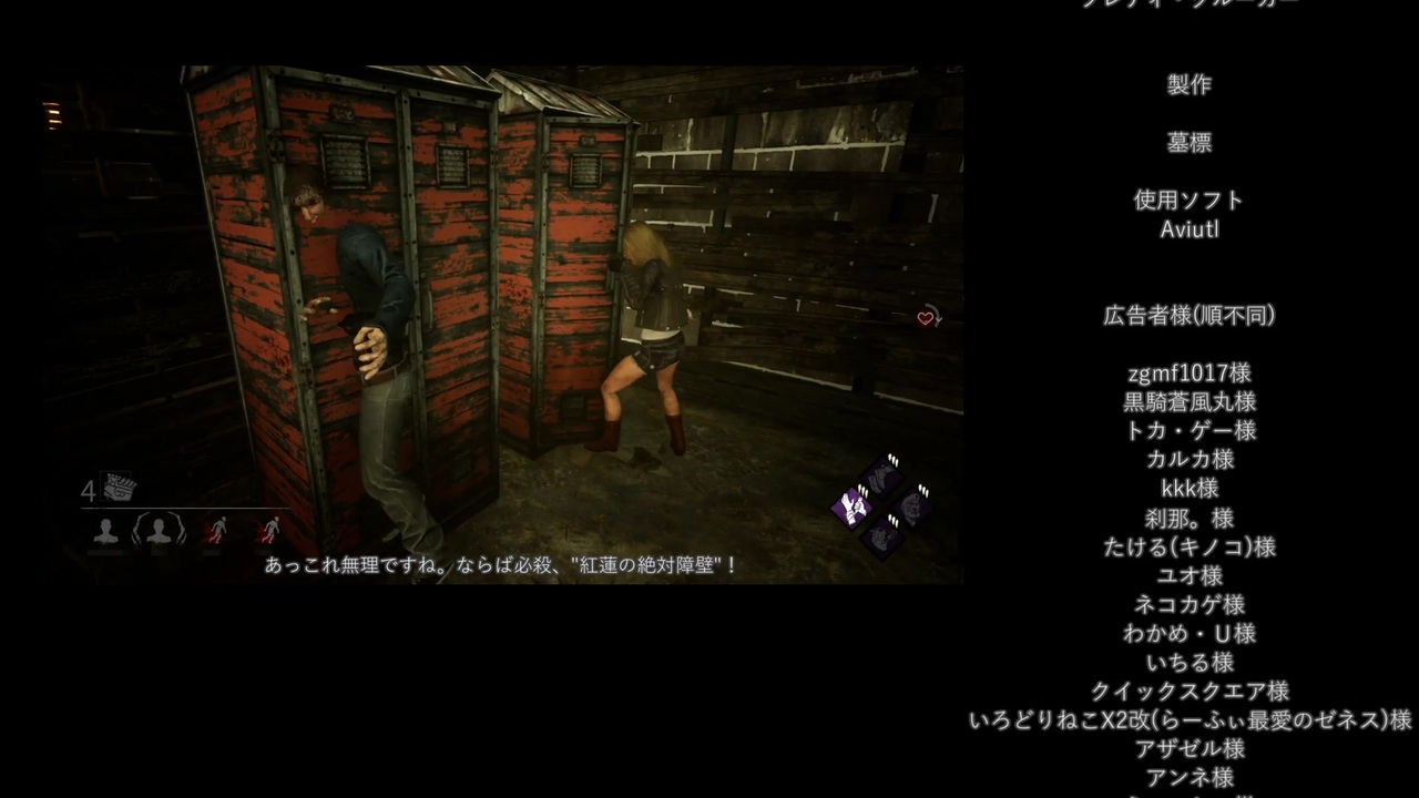 そうか……でっばいとは……勝利とは……!<br><br><a href="https://www.nicovideo.jp/watch/sm35844101" class="watch">sm35844101</a>←前回 リスト <a href="https://www.nicovideo.jp/mylist/62705262" target="_blank" rel="noopener">mylist/62705262</a> 次回→<a href="https://www.nicovideo.jp/watch/sm35995068" class="watch">sm35995068</a><br><br>この戦法・戦術には危険な成分が含まれています<br>用法・容量を守ってお使いください<br><br><br>以下パーク説明という名のコピペ<br><br>・ずさんな肉屋<br>生存者に攻撃を与えると効果発動<br>生存者の出血痕が残る頻度が少し・普通・大きく上昇<br>更に重傷状態(治療速度-20%)を付与する。<br>この重傷状態は治療を終えると解除される。<br><br>・戦慄<br>生存者を担いだ後、生存者によって修理中でない発電機すべてがエンティティによりブロックされ、次の16秒間修理不能になる。<br>ブロックされている発電機は白いオーラでハイライトされる。<br>このパークは100・80・60秒ごとに発動可能。<br><br>・堕落の介入<br>儀式開始時に、殺人鬼から一番離れた位置にある3発電機がエンティティによって80・100・120秒間ブロックされる<br>その間、生存者はブロックされた発電機の修理ができない<br><br>・イタチが飛び出した<br>生存者をフックに吊るすと効果発動。<br>発電機を破壊行動した際、即座に修理進行率を25%後退させる。<br>毎回吊るした後から1台目の発電機の破壊行動のみ有効。<br>このパーク効果は40・50・60秒の時間制限がある。<br>