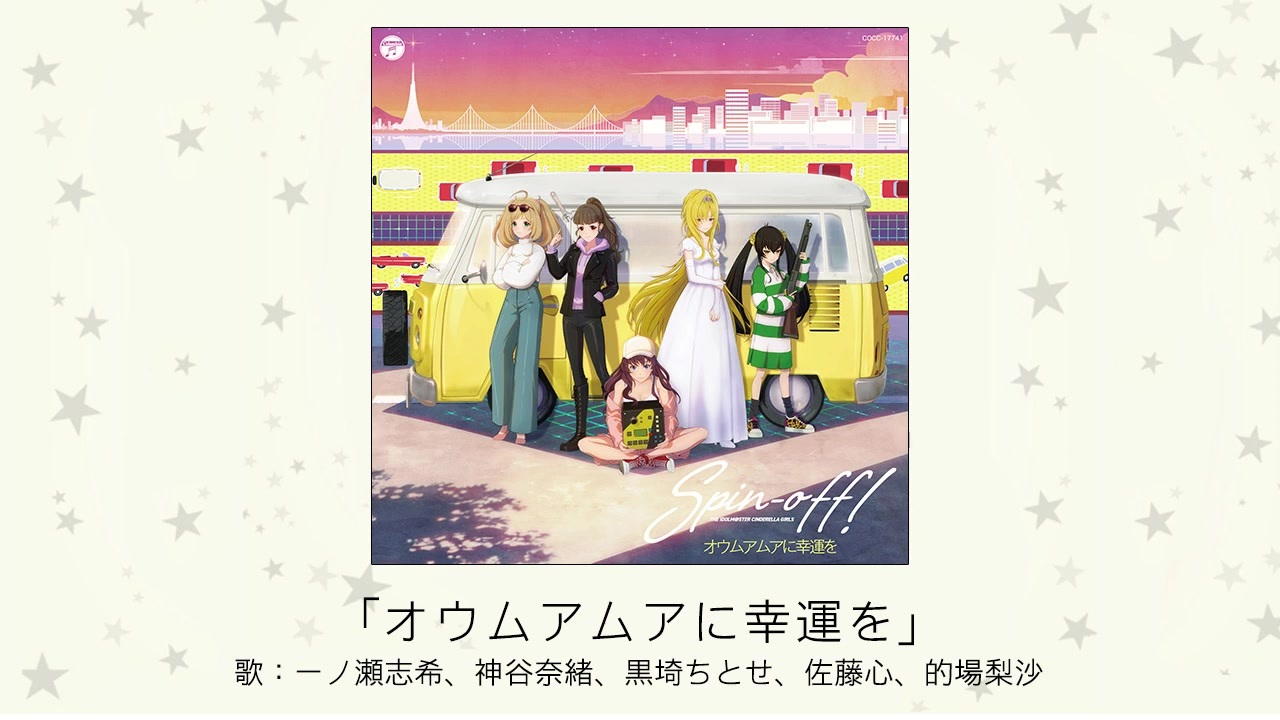2019年11月20日発売<br>THE IDOLM@STER CINDERELLA GIRLS Spin-off! オウムアムアに幸運を<br>歌:一ノ瀬志希、神谷奈緒、黒埼ちとせ、佐藤心、的場梨沙<br>COCC-17741[CD1枚組] ¥1,400+税<br>収録内容<br>Tr.01 オウムアムアに幸運を<br>作詞・作曲・編曲:広川恵一(MONACA)<br>歌:一ノ瀬志希、神谷奈緒、黒埼ちとせ、佐藤心、的場梨沙<br>Tr.02 オウムアムアに幸運を 一ノ瀬志希ソロ・リミックス 歌:一ノ瀬志希<br>Tr.03 オウムアムアに幸運を 神谷奈緒ソロ・リミックス 歌:神谷奈緒<br>Tr.04 オウムアムアに幸運を 黒埼ちとせソロ・リミックス 歌:黒埼ちとせ<br>Tr.05 オウムアムアに幸運を 佐藤心ソロ・リミックス 歌:佐藤心<br>Tr.06 オウムアムアに幸運を 的場梨沙ソロ・リミックス 歌:的場梨沙<br>Tr.07 オウムアムアに幸運を オリジナル・カラオケ<br>BONUS TRACK<br>Tr.08 オウムアムアに幸運を(Anime Version)<br>歌:一ノ瀬志希、神谷奈緒、黒埼ちとせ、佐藤心、的場梨沙<br><br>Starring by<br>一ノ瀬志希(CV:藍原ことみ)、神谷奈緒(CV:松井恵理子)、黒埼ちとせ(CV:佐倉薫)、佐藤心(CV:花守ゆみり)、的場梨沙(CV:集貝はな)<br><br>--------------------