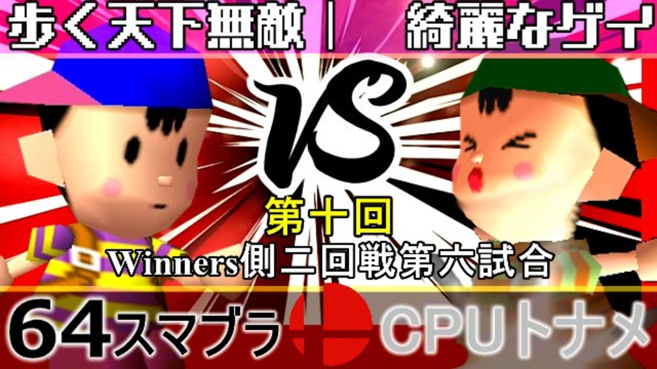 実は美少年 vs ア○ルに頭突っ込み隊<br>※どちらが勝つかアンケ結果(Twitter調べ) <br>歩く天下無敵(NE) 46% VS 綺麗なゲイ(NE) 54%<br><br><span style="color: #0000ff; font-size: 13px;"><u>※64スマブラCPUトナメ実況wiki</u></span><span style="color: #0000ff; font-size: 13px;">→</span> <a href="https://wiki3.jp/64cpu_P" target="_blank" rel="noopener nofollow">https://wiki3.jp/64cpu_P</a><br><br><span style="color: #ff0000; font-size: 24px;"><strong>次→</strong></span>【<a href="https://www.nicovideo.jp/watch/sm35966565" class="watch">sm35966565</a>】※毎日投稿<br><br>前【<a href="https://www.nicovideo.jp/watch/sm35959457" class="watch">sm35959457</a>】 Winners一回戦第一試合【<a href="https://www.nicovideo.jp/watch/sm35872182" class="watch">sm35872182</a>】 <span style="color: #000000; font-size: 13px;">予選</span>Aブロック第一試合【<a href="https://www.nicovideo.jp/watch/sm35254266" class="watch">sm35254266</a>】 <br><span style="font-size: 14px;">第十回選手紹介動画【</span><span style="color: #006699; font-size: 14px;"><a href="https://www.nicovideo.jp/watch/sm35240933" class="watch">sm35240933</a></span><span style="font-size: 14px;">】</span><br>第十回マイリスト【<a href="https://www.nicovideo.jp/mylist/65788927" target="_blank" rel="noopener">mylist/65788927</a>】<br>64スマブラCPUトナメ実況part1まとめ【<a href="https://www.nicovideo.jp/mylist/60846861" target="_blank" rel="noopener">mylist/60846861</a>】<br>その他シリーズ【<a href="https://www.nicovideo.jp/mylist/12965027" target="_blank" rel="noopener">mylist/12965027</a>】<br><br><span style="color: #00bfff; font-size: 13px;"><strong>Twitter</strong></span>【<a href="https://twitter.com/niconicopppppp" target="_blank" rel="noopener nofollow">https://twitter.com/niconicopppppp</a> 】<br><span style="color: #ff4500; font-size: 13px;"><strong>チャンネル</strong></span>【<a href="https://ch.nicovideo.jp/p-desu" target="_blank" rel="noopener">ch.nicovideo.jp/p-desu</a>】