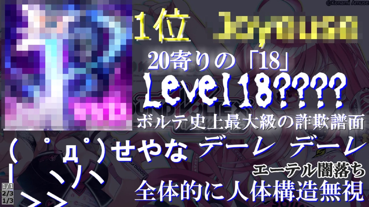 <span style="color: #ff0000; font-size: 18px;">1位は一体なんだろうなぁ・・・</span><br><span style="color: #ffd700; font-size: 14px;">※一位を予想できた人はマイリスお願いします!!!!!!!!!び!!!</span><br><br><span style="font-size: 14px;">SOUND VOLTEXⅤ(SDVX V)に収録されているLv18(計298譜面)を難曲ランキング化した動画です!<br>要望がかなり多かった動画です。お待たせしました!!!</span><br><span style="color: #0000ff; font-size: 13px;">・・・インフレしたなぁ(こなみかん)</span><br><br><br><span style="color: #262626; font-size: 14px;">過去動画はこちらから→</span><span style="color: #006699; font-size: 14px;"><a href="https://www.nicovideo.jp/mylist/45726948" target="_blank" rel="noopener">mylist/45726948</a></span><br><span style="color: #ff0000; font-size: 20px;">前回 (19,20編)→<a href="https://www.nicovideo.jp/watch/sm35749248" class="watch">sm35749248</a></span><br><span style="font-size: 14px;">前々回→</span><span style="color: #262626; font-size: 14px;"><a href="https://www.nicovideo.jp/watch/sm33124968" class="watch">sm33124968</a></span><br><span style="color: #262626;">新動画!許されないランキング(エフェクター編)はこちらから!</span><br><span style="font-size: 18px;"><strong>→<a href="https://www.nicovideo.jp/watch/sm36515772" class="watch">sm36515772</a>(エフェクター許されない人ランキング)<br>→<a href="https://www.nicovideo.jp/watch/sm36549456" class="watch">sm36549456</a>(作曲者許されない人ランキング)</strong></span><br><br>YouTube版→<a href="https://youtu.be/RBqe20qXtH0" target="_blank" rel="noopener nofollow">https://youtu.be/RBqe20qXtH0</a><br><br><span style="font-size: 14px;">ツイッターでも感想や要望等受け付けております。<br>@airk0m<br>@teruxikas</span>