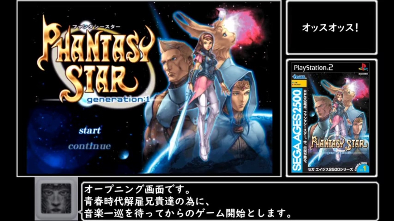 <span style="color: #000000; font-size: 14px;">プレイステーション2にて2003年8月28日発売(CD-ROM 2500円)<br>発売元 スリーディーエイジス 開発元 日本アートメディア</span><br><br>1987年発売のファンタシースターにリメイク版があったのでRTA初投稿です。<br>計測区間は、STARTを選択してからクリア後のセーブ完了まで、とします。<br>パート1は首都パセオの総督に会っ たところ までです。<br><br>パート2→<a href="https://www.nicovideo.jp/watch/sm36014537" class="watch">sm36014537</a><br>今まで投稿したパート1動画集→<a href="https://www.nicovideo.jp/mylist/67017692" target="_blank" rel="noopener">mylist/67017692</a><br><br>肉助兄貴、momo兄貴、リブナニッカ+兄貴、yanga兄貴、25シムオリオン兄貴、イルピッコロ兄貴、<br>HIDE兄貴、zakuzaku兄貴、GK56兄貴、四戸兄貴、[エトセトーラ]兄貴、髪無月兄貴、jinjin兄貴、<br>たんぽぽ兄貴、メカ沢さぶろー兄貴、くろぶた兄貴、まんげつそう兄貴、ふわふわさん兄貴、ニャー兄貴、<br>moon of red兄貴、kaji-ki兄貴、くはれ兄貴、NoT兄貴、エリクス兄貴、紫楼兄貴、鉢巻ヤンベェ兄貴、<br>taka兄貴、wara兄貴、ぐれまう兄貴、矢老兄貴、冗談兄貴、Kumatora兄貴、tonton兄貴、Strong兄貴、<br>塩ガラ兄貴、ニコス兄貴、usi兄貴、saifar兄貴、太鼓屋兄貴、White_Cat兄貴、CV兄貴、C A F E兄貴、<br>so-da兄貴、吉兎兄貴、イカモノ兄貴、RW兄貴、ばくぜろ兄貴、GLIDE兄貴、Hoshigeru兄貴、くらば兄貴、<br>jalax兄貴、yao-lungyao-lung兄貴、マーモ兄貴、カマ兄貴、ロースとビーフ兄貴、シボ兄貴、Kuronori兄貴、<br>C.H.R兄貴、sm 13869948兄貴、しょうぐん兄貴、アリサ・C・フェルミナ兄貴、あさ兄貴、Cupola兄貴、<br>めし太郎_スナッチャーRTAの人兄貴、おじさん兄貴、ATR兄貴、くら(8)兄貴、<br>広告ありがとナス!(11月28日19時現在)