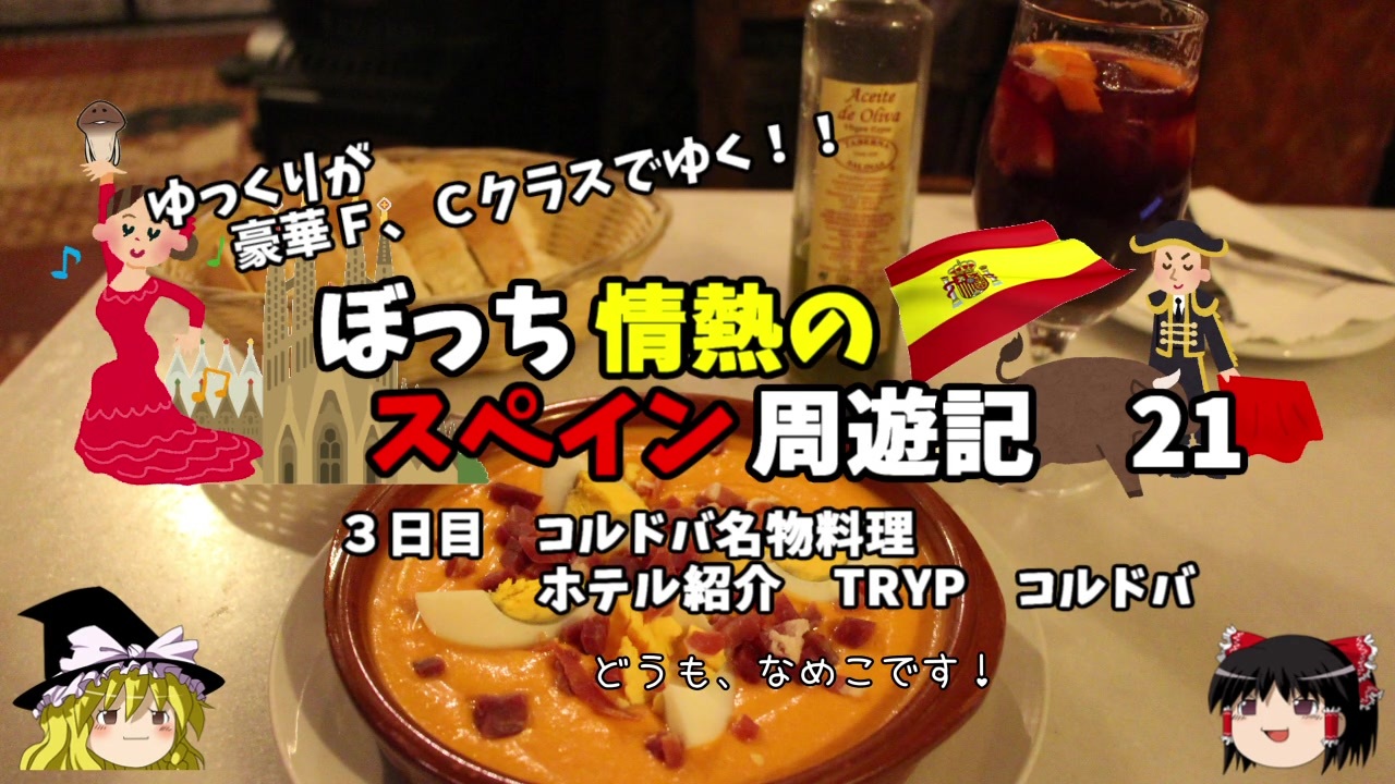 <span style="color: #ff0000; font-size: medium;"><u>※Youtubeで1話分、先行配信中 </u></span><br><span style="color: #0000ff; font-size: medium;"> <a href="http://www.youtube.com/c/なめこのぼっち旅" target="_blank" rel="noopener nofollow">http://www.youtube.com/c/なめこのぼっち旅</a></span><br><br><br>今回はコルドバでのホテルと、<br>レストランでの食事の模様をお伝えします!<br><br><span style="color: #ff0000;">コミュニティー→co2910020</span><br><br>twitter→<a href="https://twitter.com/ryontan" target="_blank" rel="noopener nofollow">https://twitter.com/ryontan</a><br><br><a href="https://www.nicovideo.jp/watch/sm35964995" class="watch">sm35964995</a>←前回 <span style="color: #ff0000;">次回 第22話→</span><a href="https://www.nicovideo.jp/watch/sm36015844" class="watch">sm36015844</a><br><br>解説・雑談系→<a href="https://www.nicovideo.jp/mylist/63171869" target="_blank" rel="noopener">mylist/63171869</a><br>今作 スペイン周遊記→<a href="https://www.nicovideo.jp/mylist/64537827" target="_blank" rel="noopener">mylist/64537827</a><br>前作 韓国トルコ旅行記→<a href="https://www.nicovideo.jp/mylist/63654428" target="_blank" rel="noopener">mylist/63654428</a><br>車中泊旅行記→<a href="https://www.nicovideo.jp/mylist/54706524" target="_blank" rel="noopener">mylist/54706524</a><br>久米島(沖縄)旅行記→<a href="https://www.nicovideo.jp/mylist/63059251" target="_blank" rel="noopener">mylist/63059251</a><br>イギリスタイ旅行記→<a href="https://www.nicovideo.jp/mylist/60044833" target="_blank" rel="noopener">mylist/60044833</a><br>クルーズ旅行記→<a href="https://www.nicovideo.jp/mylist/57397685" target="_blank" rel="noopener">mylist/57397685</a><br>ドイツ周遊記→<a href="https://www.nicovideo.jp/mylist/54938346" target="_blank" rel="noopener">mylist/54938346</a><br>北海道旅行記→<a href="https://www.nicovideo.jp/mylist/52618057" target="_blank" rel="noopener">mylist/52618057</a><br>アメリカ横断記→<a href="https://www.nicovideo.jp/mylist/48621785" target="_blank" rel="noopener">mylist/48621785</a><br>イタリア周遊記→<a href="https://www.nicovideo.jp/mylist/45763559" target="_blank" rel="noopener">mylist/45763559</a><br>NY旅行記→<a href="https://www.nicovideo.jp/mylist/44343854" target="_blank" rel="noopener">mylist/44343854</a>