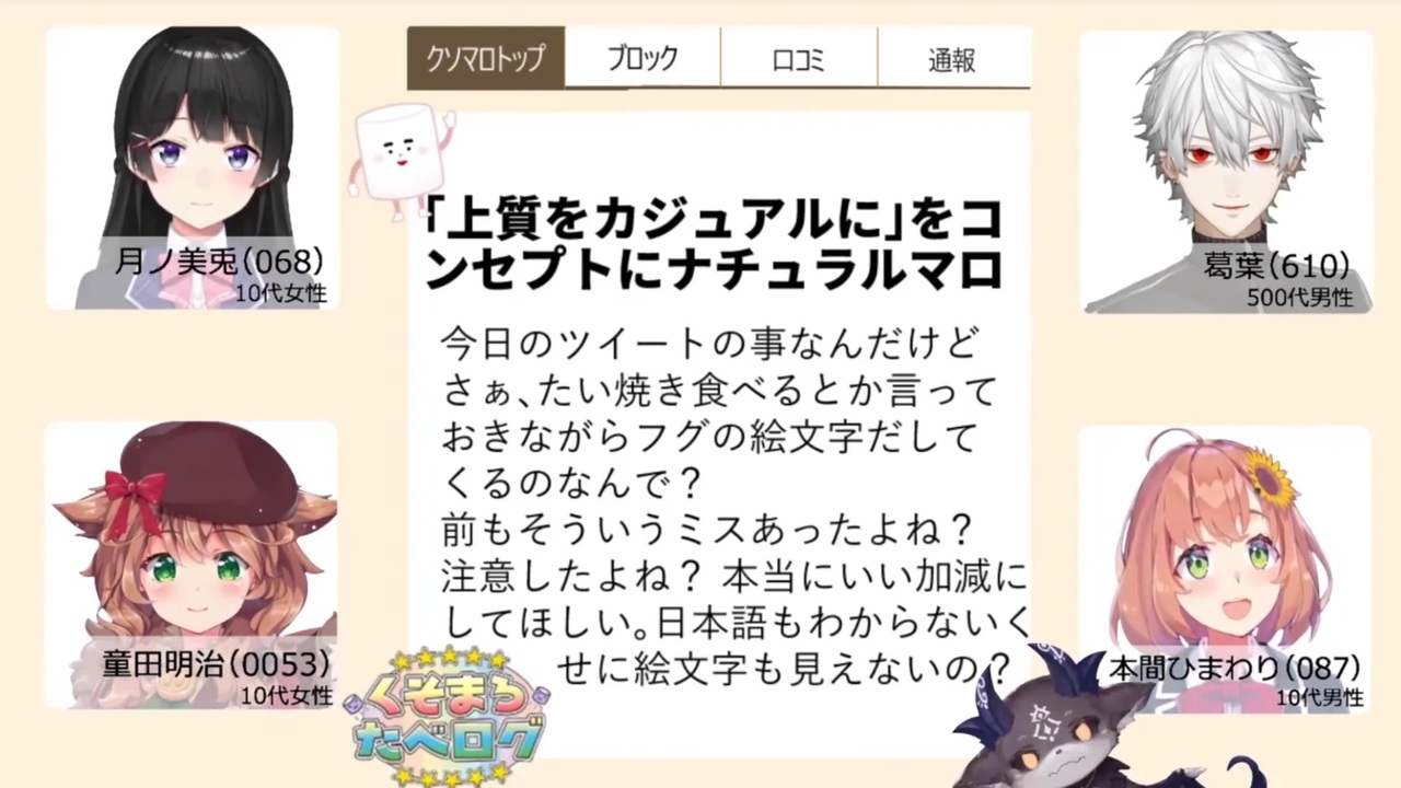 クソマロはやめましょう<br><br>動画元アーカイブ<br><br>クソマロたべログ~☆5は誰の手に~<span style="color: #000000; font-size: 13px;">【</span><a href="https://www.youtube.com/watch?v=huOMJd1kgX8&t=4835s" target="_blank" rel="noopener nofollow">https://www.youtube.com/watch?v=huOMJd1kgX8&t=4835s</a><span style="color: #000000; font-size: 13px;">】</span><br>月ノ美兎YOUTUBE 【<a href="https://www.youtube.com/channel/UCD-miitqNY3nyukJ4Fnf4_A】" target="_blank" rel="noopener nofollow">https://www.youtube.com/channel/UCD-miitqNY3nyukJ4Fnf4_A】</a><br>本間ひまわりYOUTUBE 【<a href="https://www.youtube.com/channel/UC0g1AE0DOjBYnLhkgoRWN1w】" target="_blank" rel="noopener nofollow">https://www.youtube.com/channel/UC0g1AE0DOjBYnLhkgoRWN1w】</a><br>葛葉<span style="color: #000000; font-size: 13px;">【</span><a href="https://www.youtube.com/channel/UCSFCh5NL4qXrAy9u-u2lX3g" target="_blank" rel="noopener nofollow">https://www.youtube.com/channel/UCSFCh5NL4qXrAy9u-u2lX3g</a><span style="color: #000000; font-size: 13px;">】</span><br>でびでびでびる<span style="color: #000000; font-size: 13px;">【</span><a href="https://www.youtube.com/channel/UCjlmCrq4TP1I4xguOtJ-31w" target="_blank" rel="noopener nofollow">https://www.youtube.com/channel/UCjlmCrq4TP1I4xguOtJ-31w</a><span style="color: #000000; font-size: 13px;">】</span><br>童田明治<span style="color: #000000; font-size: 13px;">【</span><a href="https://www.youtube.com/channel/UCveZ9Ic1VtcXbsyaBgxPMvg" target="_blank" rel="noopener nofollow">https://www.youtube.com/channel/UCveZ9Ic1VtcXbsyaBgxPMvg</a><span style="color: #000000; font-size: 13px;">】</span>