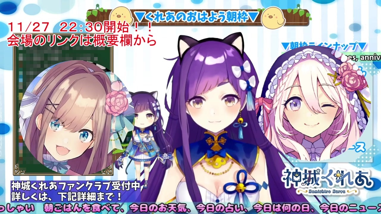 よろしくね!!!<br>▼会場<br><strong>【#すずはライブ】さいねママありがとう!三姉妹より心を込めて…!【鈴原るる/にじさんじ】</strong><br><a href="https://www.youtube.com/watch?v=IIN94g60zV0&feature=youtu.be" target="_blank" rel="noopener nofollow">https://www.youtube.com/watch?v=IIN94g60zV0&feature=youtu.be</a><br><br><br>▼<i>元動画</i><br><strong>【Vtuber】11/26おはよういってらっしゃいなのじゃ!【今日のお天気、占い、ニュース、今日は何の日】</strong><br><a href="https://www.youtube.com/watch?v=1-4pMXQKy3I" target="_blank" rel="noopener nofollow">https://www.youtube.com/watch?v=1-4pMXQKy3I</a><br><br>▼<strong>神城くれあ<br>チャンネル</strong>_<a href="https://www.youtube.com/channel/UCBQd84IW8OvM8H5jftHdvmw" target="_blank" rel="noopener nofollow">https://www.youtube.com/channel/UCBQd84IW8OvM8H5jftHdvmw</a><br><strong>Twitter</strong>_<a href="https://twitter.com/kamishiro_kurea" target="_blank" rel="noopener nofollow">https://twitter.com/kamishiro_kurea</a><br><strong>所属運営</strong>_candee・おとりざ〜みらくるとりっぷ〜<br><br>▼<strong>セフィラ・スゥ<br>チャンネル_</strong><a href="https://www.youtube.com/channel/UCHKJMmZJjLpkjZDPp_miSzg" target="_blank" rel="noopener nofollow">https://www.youtube.com/channel/UCHKJMmZJjLpkjZDPp_miSzg</a><br><strong>Twitter_</strong><a href="https://twitter.com/SephiraSu" target="_blank" rel="noopener nofollow">https://twitter.com/SephiraSu</a><br><strong>所属・運営</strong>_CAM(キャム) ・ CAMFORTUN<br><br>▼<strong>鈴原るる<br>チャンネル_</strong><a href="https://www.youtube.com/channel/UC_a1ZYZ8ZTXpjg9xUY9sj8w" target="_blank" rel="noopener nofollow">https://www.youtube.com/channel/UC_a1ZYZ8ZTXpjg9xUY9sj8w</a><br><strong>Twitter_</strong><a href="https://twitter.com/lulu_suzuhara" target="_blank" rel="noopener nofollow">https://twitter.com/lulu_suzuhara</a><br><strong>所属・運営</strong>_いちから ・ にじさんじ