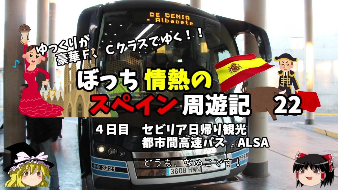 <span style="color: #ff0000; font-size: medium;"><u>※Youtubeで1話分、先行配信中 </u></span><br><span style="color: #0000ff; font-size: medium;"> <a href="http://www.youtube.com/c/なめこのぼっち旅" target="_blank" rel="noopener nofollow">http://www.youtube.com/c/なめこのぼっち旅</a></span><br><br><br>本日は高速バスに乗り、セビリアに向かいますよ!<br><br><span style="color: #ff0000;">コミュニティー→co2910020</span><br><br>twitter→<a href="https://twitter.com/ryontan" target="_blank" rel="noopener nofollow">https://twitter.com/ryontan</a><br><br><a href="https://www.nicovideo.jp/watch/sm35981413" class="watch">sm35981413</a>←前回 <span style="color: #ff0000;">次回 第23話→</span><a href="https://www.nicovideo.jp/watch/sm36029295" class="watch">sm36029295</a><br><br>解説・雑談系→<a href="https://www.nicovideo.jp/mylist/63171869" target="_blank" rel="noopener">mylist/63171869</a><br>今作 スペイン周遊記→<a href="https://www.nicovideo.jp/mylist/64537827" target="_blank" rel="noopener">mylist/64537827</a><br>前作 韓国トルコ旅行記→<a href="https://www.nicovideo.jp/mylist/63654428" target="_blank" rel="noopener">mylist/63654428</a><br>車中泊旅行記→<a href="https://www.nicovideo.jp/mylist/54706524" target="_blank" rel="noopener">mylist/54706524</a><br>久米島(沖縄)旅行記→<a href="https://www.nicovideo.jp/mylist/63059251" target="_blank" rel="noopener">mylist/63059251</a><br>イギリスタイ旅行記→<a href="https://www.nicovideo.jp/mylist/60044833" target="_blank" rel="noopener">mylist/60044833</a><br>クルーズ旅行記→<a href="https://www.nicovideo.jp/mylist/57397685" target="_blank" rel="noopener">mylist/57397685</a><br>ドイツ周遊記→<a href="https://www.nicovideo.jp/mylist/54938346" target="_blank" rel="noopener">mylist/54938346</a><br>北海道旅行記→<a href="https://www.nicovideo.jp/mylist/52618057" target="_blank" rel="noopener">mylist/52618057</a><br>アメリカ横断記→<a href="https://www.nicovideo.jp/mylist/48621785" target="_blank" rel="noopener">mylist/48621785</a><br>イタリア周遊記→<a href="https://www.nicovideo.jp/mylist/45763559" target="_blank" rel="noopener">mylist/45763559</a><br>NY旅行記→<a href="https://www.nicovideo.jp/mylist/44343854" target="_blank" rel="noopener">mylist/44343854</a>
