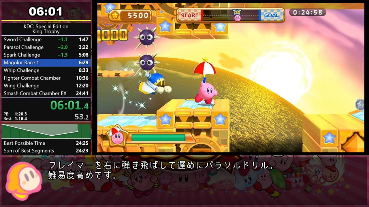 いわゆる全プラチナRTA。一つのミスが致命傷に!<br>WRを3回、計1分34秒更新し投稿時点で世界記録。<br>『星のカービィ 20周年スペシャルコレクション』の「キングトロフィー」のRTA解説動画です。<br><br>(訂正)<br>8:21 ×ジャンプうち ○天じょううち<br><br>★ルール<br>⏱あきファイルを選択した瞬間に計測開始、「キングトロフィーゲット!」のメッセージが出た瞬間に計測終了。<br><br>★プレイ環境<br>機種:Wii U<br>バージョン:日本版<br>映像出力:720p<br><br>試行回数 144<br>試行時間 13:48:00<br>達成日時 2019/11/28<br><br>★記録表<br><a href="https://www.speedrun.com/kdcollection#All_Challenges_-_King_Trophy1" target="_blank" rel="noopener nofollow">https://www.speedrun.com/kdcollection#All_Challenges_-_King_Trophy1</a><br><br>★前作 カービィWii 100%RTA解説動画 <br><a href="https://www.nicovideo.jp/watch/sm35345508" class="watch">sm35345508</a><br><br>★Twitch<br><a href="https://www.twitch.tv/shirokirby" target="_blank" rel="noopener nofollow">https://www.twitch.tv/shirokirby</a><br /><br>★投稿動画まとめ<br><a href="https://www.nicovideo.jp/mylist/59901580" target="_blank" rel="noopener">mylist/59901580</a><br><br>無断転載禁止