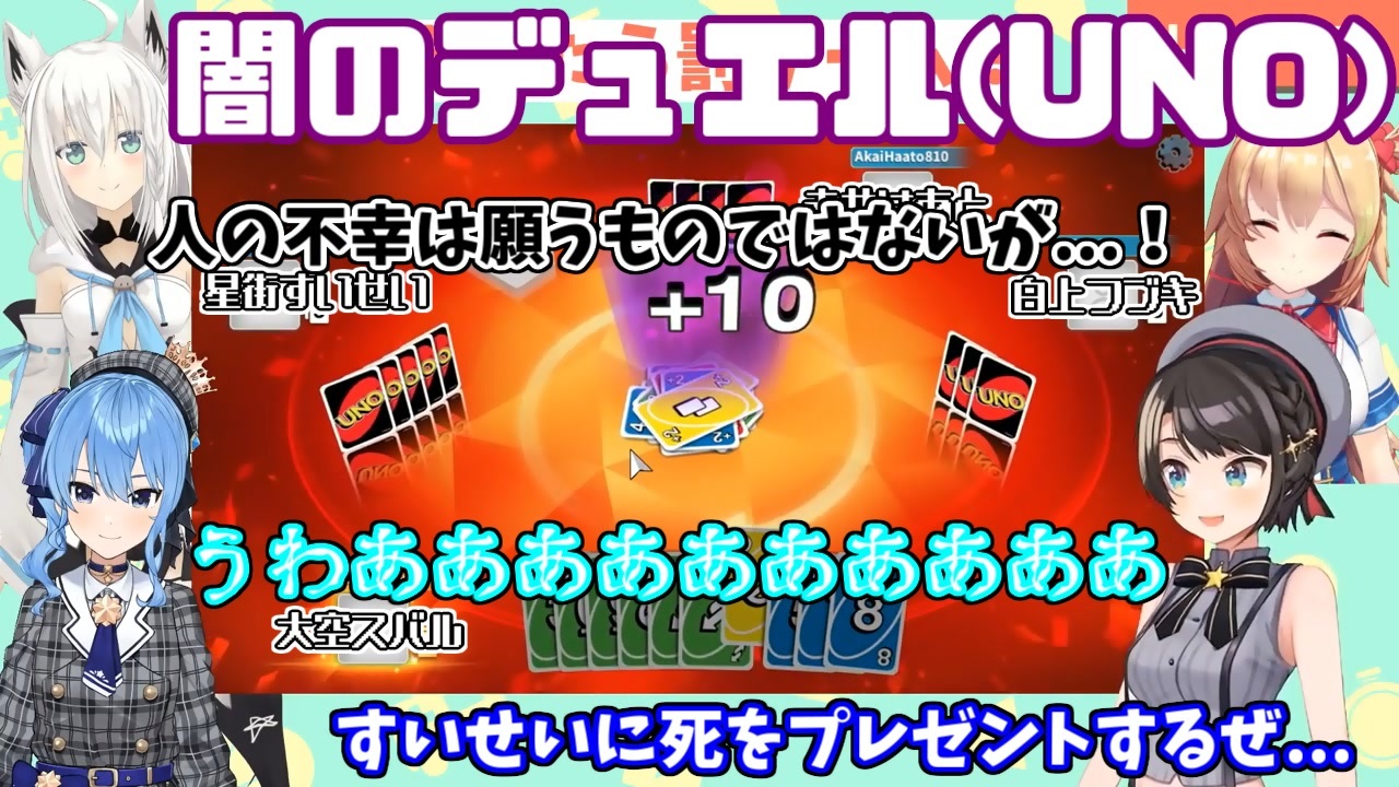 元動画:<span style="font-size: 16px;"><strong>【負けたら】おい、UNOしろよ…!!!!!!【罰ゲーム】</strong></span><br><a href="https://www.youtube.com/watch?v=TxtuJC_TwaE" target="_blank" rel="noopener nofollow">https://www.youtube.com/watch?v=TxtuJC_TwaE</a><br><br><br><strong>白上フブキ(ホロライブゲーマーズ)</strong><br>チャンネル:<a href="https://www.youtube.com/channel/UCdn5BQ06XqgXoAxIhbqw5Rg" target="_blank" rel="noopener nofollow">https://www.youtube.com/channel/UCdn5BQ06XqgXoAxIhbqw5Rg</a><br>Twitter:<a href="https://twitter.com/shirakamifubuki" target="_blank" rel="noopener nofollow">https://twitter.com/shirakamifubuki</a><br><br><strong>赤井はあと(ホロライブ)</strong><br>チャンネル:<a href="https://www.youtube.com/channel/UC1CfXB_kRs3C-zaeTG3oGyg" target="_blank" rel="noopener nofollow">https://www.youtube.com/channel/UC1CfXB_kRs3C-zaeTG3oGyg</a><br>Twitter:<a href="https://twitter.com/akaihaato" target="_blank" rel="noopener nofollow">https://twitter.com/akaihaato</a><br><br><strong>大空スバル(ホロライブ)</strong><br>チャンネル:<a href="https://www.youtube.com/channel/UCvzGlP9oQwU--Y0r9id_jnA" target="_blank" rel="noopener nofollow">https://www.youtube.com/channel/UCvzGlP9oQwU--Y0r9id_jnA</a><br>Twitter:<a href="https://twitter.com/oozorasubaru" target="_blank" rel="noopener nofollow">https://twitter.com/oozorasubaru</a><br><br><strong>星街すいせい(ホロライブ)</strong><br>チャンネル:<a href="https://www.youtube.com/channel/UC5CwaMl1eIgY8h02uZw7u8A" target="_blank" rel="noopener nofollow">https://www.youtube.com/channel/UC5CwaMl1eIgY8h02uZw7u8A</a><br>Twitter:<a href="https://twitter.com/suisei_hosimati" target="_blank" rel="noopener nofollow">https://twitter.com/suisei_hosimati</a>