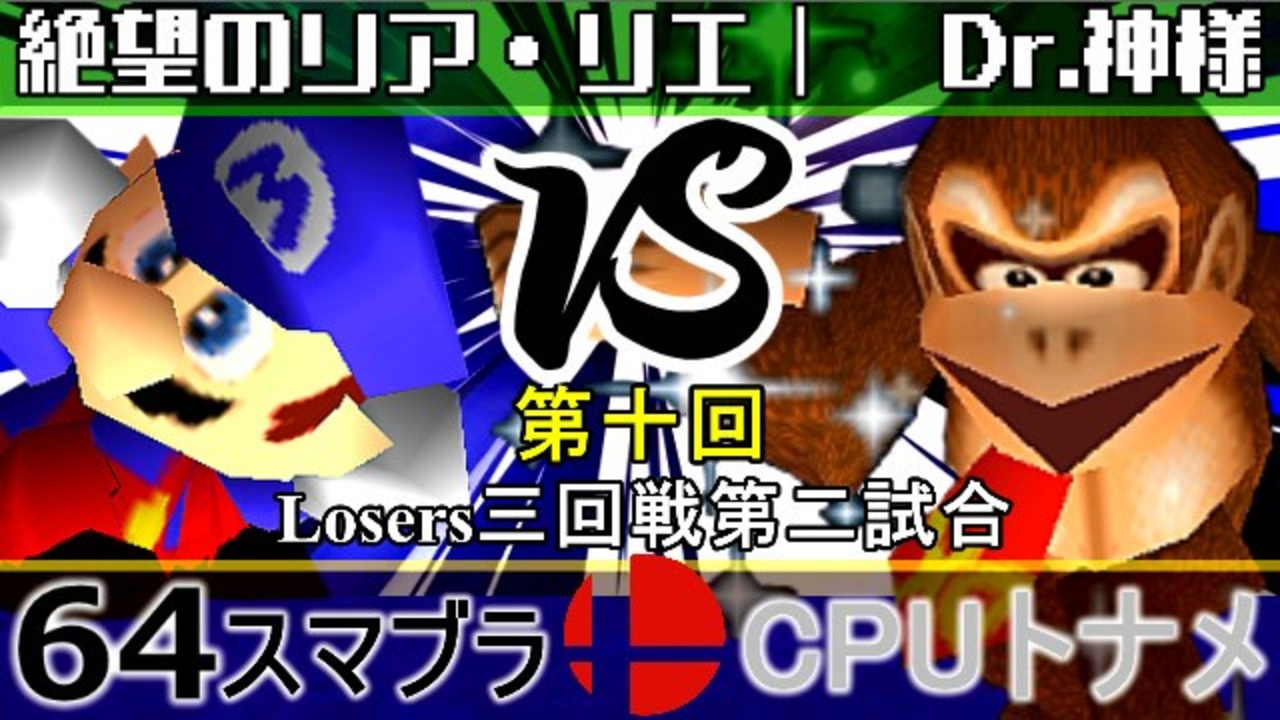 絶望の化け物 vs Dr.ジャイアントキリング<br>※どちらが勝つかアンケ結果(Twitter調べ) <br>絶望のリア・リエ(MA) 57% VS Dr.神様(DK) 43%<br><br><span style="color: #0000ff; font-size: 13px;"><u>※64スマブラCPUトナメ実況wiki</u></span><span style="color: #0000ff; font-size: 13px;">→</span> <a href="https://wiki3.jp/64cpu_P" target="_blank" rel="noopener nofollow">https://wiki3.jp/64cpu_P</a><br><br><span style="color: #ff0000; font-size: 24px;"><strong>次→</strong></span>【<a href="https://www.nicovideo.jp/watch/sm36044289" class="watch">sm36044289</a>】※毎日投稿<br><br>前【<a href="https://www.nicovideo.jp/watch/sm36035084" class="watch">sm36035084</a>】 Winners一回戦第一試合【<a href="https://www.nicovideo.jp/watch/sm35872182" class="watch">sm35872182</a>】 <span style="color: #000000; font-size: 13px;">予選</span>Aブロック第一試合【<a href="https://www.nicovideo.jp/watch/sm35254266" class="watch">sm35254266</a>】 <br><span style="font-size: 14px;">第十回選手紹介動画【</span><span style="color: #006699; font-size: 14px;"><a href="https://www.nicovideo.jp/watch/sm35240933" class="watch">sm35240933</a></span><span style="font-size: 14px;">】</span><br>第十回マイリスト【<a href="https://www.nicovideo.jp/mylist/65788927" target="_blank" rel="noopener">mylist/65788927</a>】<br>64スマブラCPUトナメ実況part1まとめ【<a href="https://www.nicovideo.jp/mylist/60846861" target="_blank" rel="noopener">mylist/60846861</a>】<br>その他シリーズ【<a href="https://www.nicovideo.jp/mylist/12965027" target="_blank" rel="noopener">mylist/12965027</a>】<br><br><span style="color: #00bfff; font-size: 13px;"><strong>Twitter</strong></span>【<a href="https://twitter.com/niconicopppppp" target="_blank" rel="noopener nofollow">https://twitter.com/niconicopppppp</a> 】<br><span style="color: #ff4500; font-size: 13px;"><strong>チャンネル</strong></span>【<a href="https://ch.nicovideo.jp/p-desu" target="_blank" rel="noopener">ch.nicovideo.jp/p-desu</a>】