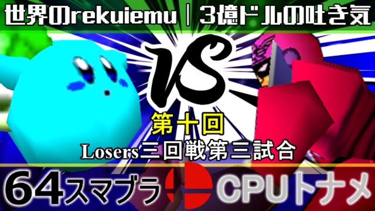 緑甲羅マスター vs 浦安の始祖<br>※どちらが勝つかアンケ結果(Twitter調べ) <br>世界のrekuiemu(KI) 39% VS 3億ドルの吐き気(FA) 61%<br><br><span style="color: #0000ff; font-size: 13px;"><u>※64スマブラCPUトナメ実況wiki</u></span><span style="color: #0000ff; font-size: 13px;">→</span> <a href="https://wiki3.jp/64cpu_P" target="_blank" rel="noopener nofollow">https://wiki3.jp/64cpu_P</a><br><br><span style="color: #ff0000; font-size: 24px;"><strong>次→</strong></span>【<a href="https://www.nicovideo.jp/watch/sm36049130" class="watch">sm36049130</a>】※毎日投稿<br><br>前【<a href="https://www.nicovideo.jp/watch/sm36040843" class="watch">sm36040843</a>】 Winners一回戦第一試合【<a href="https://www.nicovideo.jp/watch/sm35872182" class="watch">sm35872182</a>】 <span style="color: #000000; font-size: 13px;">予選</span>Aブロック第一試合【<a href="https://www.nicovideo.jp/watch/sm35254266" class="watch">sm35254266</a>】 <br><span style="font-size: 14px;">第十回選手紹介動画【</span><span style="color: #006699; font-size: 14px;"><a href="https://www.nicovideo.jp/watch/sm35240933" class="watch">sm35240933</a></span><span style="font-size: 14px;">】</span><br>第十回マイリスト【<a href="https://www.nicovideo.jp/mylist/65788927" target="_blank" rel="noopener">mylist/65788927</a>】<br>64スマブラCPUトナメ実況part1まとめ【<a href="https://www.nicovideo.jp/mylist/60846861" target="_blank" rel="noopener">mylist/60846861</a>】<br>その他シリーズ【<a href="https://www.nicovideo.jp/mylist/12965027" target="_blank" rel="noopener">mylist/12965027</a>】<br><br><span style="color: #00bfff; font-size: 13px;"><strong>Twitter</strong></span>【<a href="https://twitter.com/niconicopppppp" target="_blank" rel="noopener nofollow">https://twitter.com/niconicopppppp</a> 】<br><span style="color: #ff4500; font-size: 13px;"><strong>チャンネル</strong></span>【<a href="https://ch.nicovideo.jp/p-desu" target="_blank" rel="noopener">ch.nicovideo.jp/p-desu</a>】
