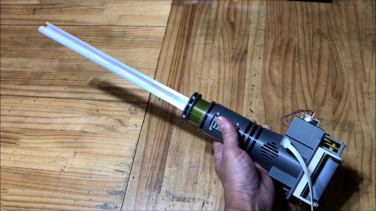 自動で伸縮するライトセーバーを作ってみました。<br>製作は2011年から初めているので、8年間いろいろな試行錯誤の末に電動式の機構で製作しました。<br><br>構造はコンベックスメジャーのように凸型のフィルムの送り出し、巻き戻しをモータで行います。<br>ストローのような円筒形のものを縦に裂いたようなものであれば、棒状のものを巻き取り細かく収納することが可能です。<br><br>ちなみにこの構造、日本の特許では公開番号『特開平9−124234』があり、これはすでに特許の期限を過ぎています。<br>最近は、ディズニーが米国特許『US10065127』として「Sword Device with Retractable, Internally Illuminated Blade(内部が発光する伸縮式の刃を搭載した剣状装置)」という名前で特許を申請しています。<br>が、中身をみると機構は同じで伸縮する部位にLEDをつけただけなので、過去特許などの公知の事実から容易に類推できるとして公開だけして他者からの特許攻撃を防ぐためなのかもしれません。<br><br>twitter : @degochi<br>web : <a href="http://degochi.blog.so-net.ne.jp/" target="_blank" rel="noopener nofollow">http://degochi.blog.so-net.ne.jp/</a><br>BGM : Siege of Orleans (written by ilodolly) をお借りしました<br> フリーBGM DOVA-SYNDROME<br> <a href="https://dova-s.jp/bgm/play8337.html" target="_blank" rel="noopener nofollow">https://dova-s.jp/bgm/play8337.html</a>
