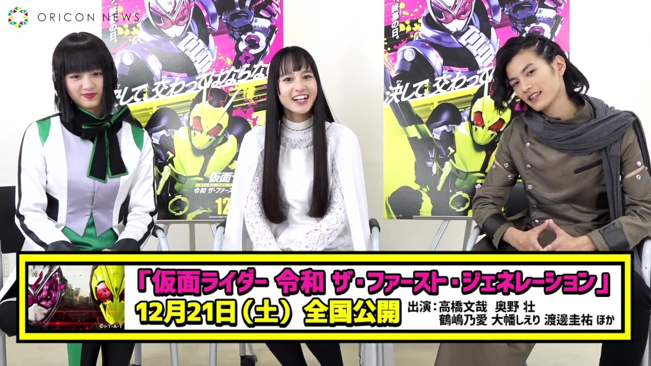 <span style="color: #0d0d0d; font-size: 14px;">「令和仮面ライダー元年」の第1作『仮面ライダーゼロワン』と、最後の平成仮面ライダーとして歴史に名を刻んだ『仮面ライダージオウ』の冬の新作映画『仮面ライダー 令和 ザ・ファースト・ジェネレーション』(12月21日公開)を記念して、『ゼロワン』×『ジオウ』キャストのクロストークが実現。<br><br> 第1弾として『ゼロワン』イズ役の鶴嶋乃愛(18)、『ジオウ』ツクヨミ役の大幡しえり(21)に、仮面ライダーウォズ/ウォズ役の渡邊圭祐(25)を加えて“ヒロイン”インタビューを実施。撮影秘話などを聞いた。<br><br><br>■作品情報<br>『仮面ライダー 令和 ザ・ファースト・ジェネレーション』<br>12月21日(土)全国公開<br><br>~イントロダクション~<br>劇場版 仮面ライダー新時代。<br>2000年から始まった平成仮面ライダーシリーズが20作品目「仮面ライダージオウ」にて終わりを告げた。そしてこの冬、2009年から毎年公開してきた仮面ライダー冬映画は、新元号・令和の幕開けとともに新時代へと突入する。<br>令和第1作「仮面ライダーゼロワン」は、人工知能=AIをテーマに、様々な職業の世界を通してAIが導入された未来の姿と、そこで生まれる悪との戦いを描いている。その歴史に幕を閉じたはずの「仮面ライダージオウ」が、なぜ新時代の「仮面ライダーゼロワン」と関わるのか。<br>交わるはずのない2つの世界が並び立つ時、次なるステージへの扉が開かれる。<br>平成×令和 混ぜるな危険。記念すべき令和仮面ライダーシリーズ劇場版第1作。<br>これまでとは一線を画す、予想だにしない物語が、いま、始まる。</span><br><br>