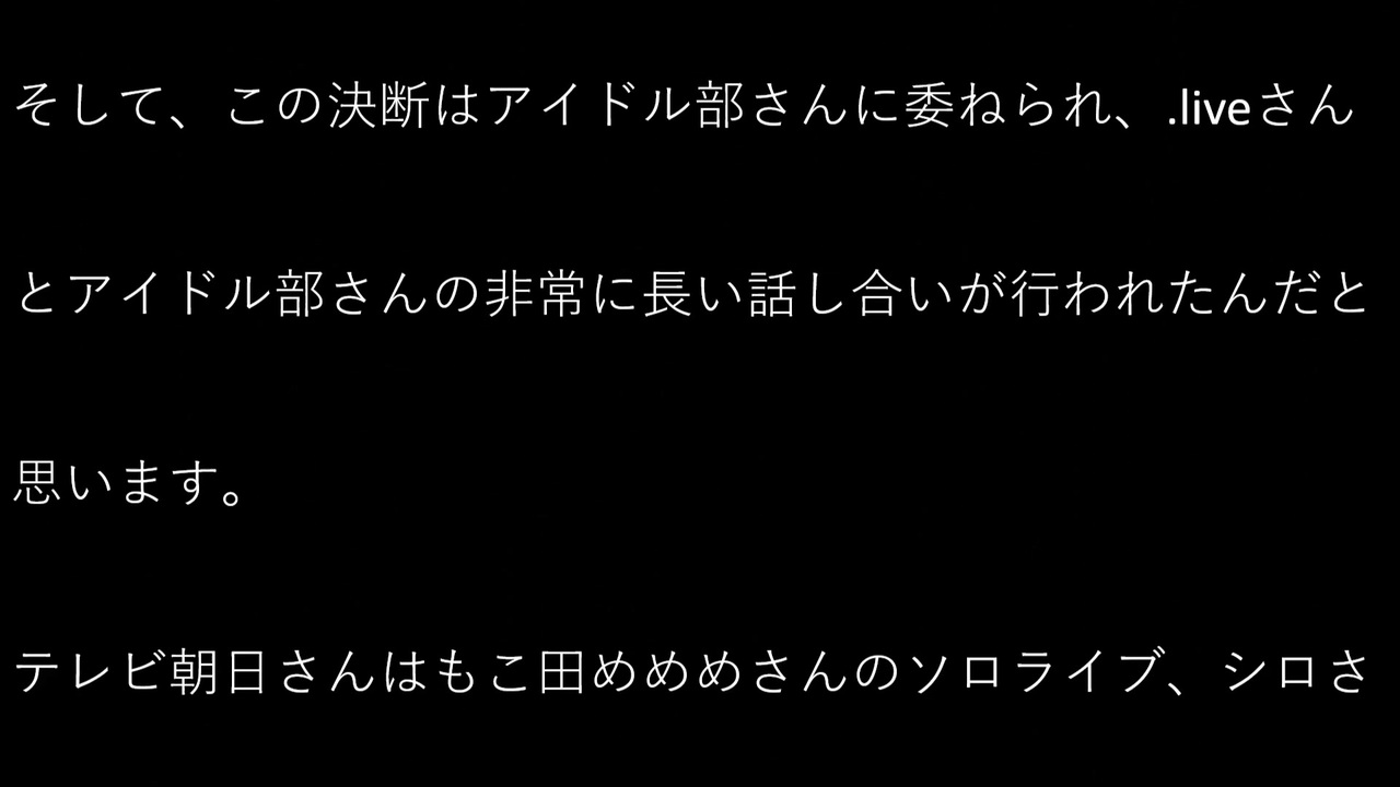 追記<br>この動画の推測は私も大きく再考・訂正の余地が考えています。<br><br><br>[本動画の今後]<br><strong>残す。</strong>ただし、可能性は低いけど次動画を上げるなら、代わりにこの動画は削除<br>理由は字数の都合上省略させていただきます。<br><br><br>[補足]<br>①「なんで運営が事実を公表できない」→この推測では、勝手ながらテレ朝さんが大きくかかわっているから。と、しています<br>②「そんなことしたら、テレビはvtuberと仕事しにくくなるだろ」→口封じすれば問題ないと考えました<br>③「テレビに出れないだけで演者を捨てるか」→テレ朝さんがシロさんにもかかわっっていることを考えると、アイドル部一人の失態で、シロさんの仕事まで影響を及ぼすわけにはいかないと考えました。<br>④「テレ朝はたまを使わなければいい」「打ち切ればいい」→私は、テレ朝さんが騒動に大きく関わっていることを知られたくなかったと考えました<br>⑤「たまは話し合いに参加したかったと言ってるのに、後ろ暗くて参加できないは矛盾」→後ろ暗くて参加できなかったと考えているわけではありません。たまさんが「夜桜たまを続けたい」と言っても、他メンバーから「あなたのせいだから黙ってて」みたいなことを言われたら黙るしかないかなと考えました。それが、たまさんの「できることはあった」につながり、ちえりさんの「会話の中で感じたことの積み重ね」につながるのかなと考えました。<br>⑥「運営は悪くない、はない」→仰る通りだと思います。少なからず報連相不足はあり、引用とはいえ、流石に「悪くはない」は言い過ぎたと思いました。しかし、せめて「ましだった」ぐらいになってくれれば…と願うばかりです<br>⑦「だったら、騒動を助長したちえりもテレ朝からお咎めあるだろ」→テレ朝さんはたまさんのライブを台無しにしたことで、腹を立てたと考えました。そのため騒動を大きくしたことは関係ないと考えました。それに、めめめさんのライブまで台無しになるのを防いでくれたと、捉えることは出来ないでしょうか<br>⑧「伝わってないのに、ファインプレーはおかしい」→ここはどうでもいいのですが、「上手く伝えることができた」という意味ではなく、「上手くNGワードを回避することができた」という意味で用いました<br>⑨「もちとたまがtwitterで仲良すぎる」→私はアイドル部内で、夜桜たま派かテレ朝派かで対立が起きたと考えました。もちさんが夜桜たま派であればそこまで不可解ではないと感じました。実際夜桜たまさんは残留メンバー全員と仲が悪いということでも無さそうですし