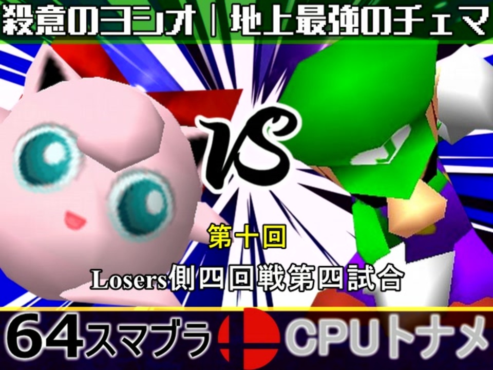 ヨシオ族の突然変異 vs 地上では最強<br>※どちらが勝つかアンケ結果(Twitter調べ) <br>殺意のヨシオ(PU) 77% VS 地上最強のチェマ(LU) 23%<br><br><span style="color: #0000ff; font-size: 13px;"><u>※64スマブラCPUトナメ実況wiki</u></span><span style="color: #0000ff; font-size: 13px;">→</span> <a href="https://wiki3.jp/64cpu_P" target="_blank" rel="noopener nofollow">https://wiki3.jp/64cpu_P</a><br><br><span style="color: #ff0000; font-size: 24px;"><strong>次→</strong></span>【<a href="https://www.nicovideo.jp/watch/sm36076463" class="watch">sm36076463</a>】※毎日投稿<br><br>前【<a href="https://www.nicovideo.jp/watch/sm36067397" class="watch">sm36067397</a>】 Winners一回戦第一試合【<a href="https://www.nicovideo.jp/watch/sm35872182" class="watch">sm35872182</a>】 <span style="color: #000000; font-size: 13px;">予選</span>Aブロック第一試合【<a href="https://www.nicovideo.jp/watch/sm35254266" class="watch">sm35254266</a>】 <br><span style="font-size: 14px;">第十回選手紹介動画【</span><span style="color: #006699; font-size: 14px;"><a href="https://www.nicovideo.jp/watch/sm35240933" class="watch">sm35240933</a></span><span style="font-size: 14px;">】</span><br>第十回マイリスト【<a href="https://www.nicovideo.jp/mylist/65788927" target="_blank" rel="noopener">mylist/65788927</a>】<br>64スマブラCPUトナメ実況part1まとめ【<a href="https://www.nicovideo.jp/mylist/60846861" target="_blank" rel="noopener">mylist/60846861</a>】<br>その他シリーズ【<a href="https://www.nicovideo.jp/mylist/12965027" target="_blank" rel="noopener">mylist/12965027</a>】<br><br><span style="color: #00bfff; font-size: 13px;"><strong>Twitter</strong></span>【<a href="https://twitter.com/niconicopppppp" target="_blank" rel="noopener nofollow">https://twitter.com/niconicopppppp</a> 】<br><span style="color: #ff4500; font-size: 13px;"><strong>チャンネル</strong></span>【<a href="https://ch.nicovideo.jp/p-desu" target="_blank" rel="noopener">ch.nicovideo.jp/p-desu</a>】