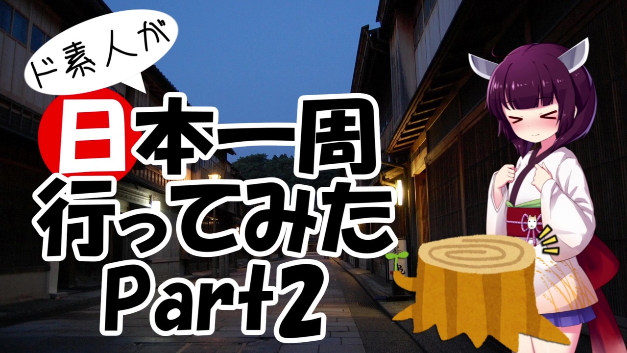 金沢は文化的に一番好きな都市ですね。<br>観光したり、美味しいもの食べたり、聖地巡礼したり・・・<br>これ普通の旅行動画じゃないかい?<br><br>※1080p対応です<br><br>前→Part1【<a href="https://www.nicovideo.jp/watch/sm36018324" class="watch">sm36018324</a>】<br>次→Part3【<a href="https://www.nicovideo.jp/watch/sm36156219" class="watch">sm36156219</a>】<br><br>ド素人が日本一周行ってみたのマイリスト→<a href="https://www.nicovideo.jp/mylist/64280441" target="_blank" rel="noopener">mylist/64280441</a><br><br>YouTube版→<a href="https://www.youtube.com/channel/UCTsmHpxtyOEQO_tkqZ4D42A" target="_blank" rel="noopener nofollow">https://www.youtube.com/channel/UCTsmHpxtyOEQO_tkqZ4D42A</a><br><br>詳細な感想などはTwitterやブログでどうぞ。<br>Twitter:<a href="https://twitter.com/kyobon_beginner" target="_blank" rel="noopener nofollow">https://twitter.com/kyobon_beginner</a><br>ブログ:<a href="https://kyobon-beginner.hatenablog.com" target="_blank" rel="noopener nofollow">https://kyobon-beginner.hatenablog.com</a>