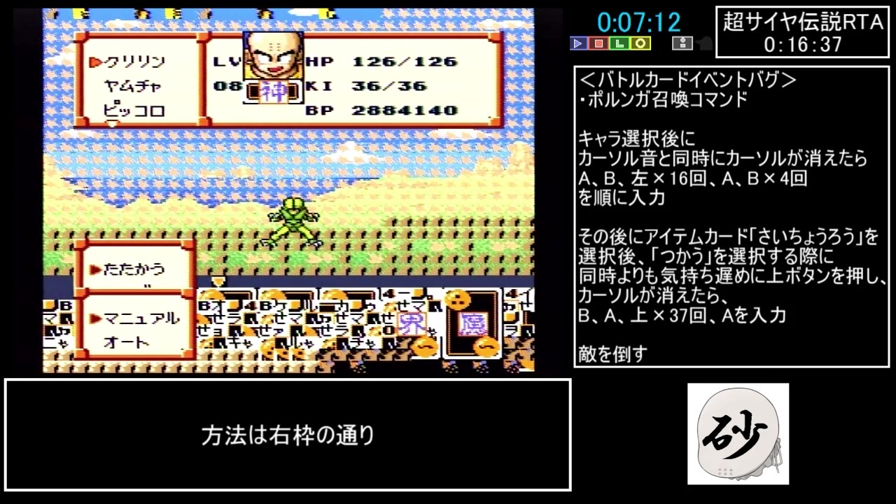達成日:Saturday,14th December 2019<br>プレイ環境:SFC実機、純正コントローラー<br>撮影環境:GV-USB2による録画(分配器によりテレビに出力し、ラグなしの環境でプレイしています)<br>ソフトバージョン:初期版<br>バグ利用:あり<br>計測方法:電源ON~スタッフロール後のEND表示まで<br> <br>●チャートの参考にしました動画→<a href="https://www.nicovideo.jp/watch/sm34683223" class="watch">sm34683223</a><br>●本チャートの一部を試走して頂いた方のコミュ→co3557076<br>●生配信はしていないため、あくまで参考記録と思ってください。<br> <br>動画投稿並みのペースでつぶやかないツイッター→<a href="https://twitter.com/Sand_Bag_nico" target="_blank" rel="noopener nofollow">https://twitter.com/Sand_Bag_nico</a><br> <br>さて、別の動画の作成に取り掛からなきゃ…(´・ω・`) →<a href="https://www.nicovideo.jp/watch/sm36559093" class="watch">sm36559093</a> <br><br>さらに半分以下に縮められた模様…→<a href="https://www.nicovideo.jp/watch/sm41682885" class="watch">sm41682885</a>