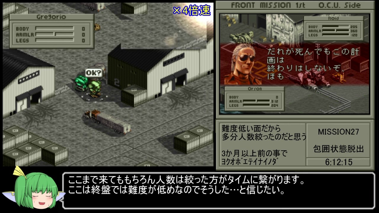 もはやネタも気力も見所も限回<br><br>MISSION27~29終了まで<br><br><br>使用機種:PSアーカイブス版<br>使用ハード:PSVITATV<br><br>参考文献:SFC版ミリタリーガイド<br>データ引用元:<a href="https://tenmou.net" target="_blank" rel="noopener nofollow">https://tenmou.net</a><br>マップ借用元:<a href="https://w.atwiki.jp/frontmission1st/pages/1.html" target="_blank" rel="noopener nofollow">https://w.atwiki.jp/frontmission1st/pages/1.html</a><br><br><br>Part1→<a href="https://www.nicovideo.jp/watch/sm35762513" class="watch">sm35762513</a><br>前(Part12)→<a href="https://www.nicovideo.jp/watch/sm36080775" class="watch">sm36080775</a> <span style="font-size: 18px;">次→<a href="https://www.nicovideo.jp/watch/sm36166201" class="watch">sm36166201</a></span><br>マイリスト<br><a href="https://www.nicovideo.jp/mylist/66628757" target="_blank" rel="noopener">mylist/66628757</a><br><br>投稿動画Part1集<br><a href="https://www.nicovideo.jp/mylist/58180228" target="_blank" rel="noopener">mylist/58180228</a><br><br>総勢149名(義)の兄貴達、宣伝アリシャス!