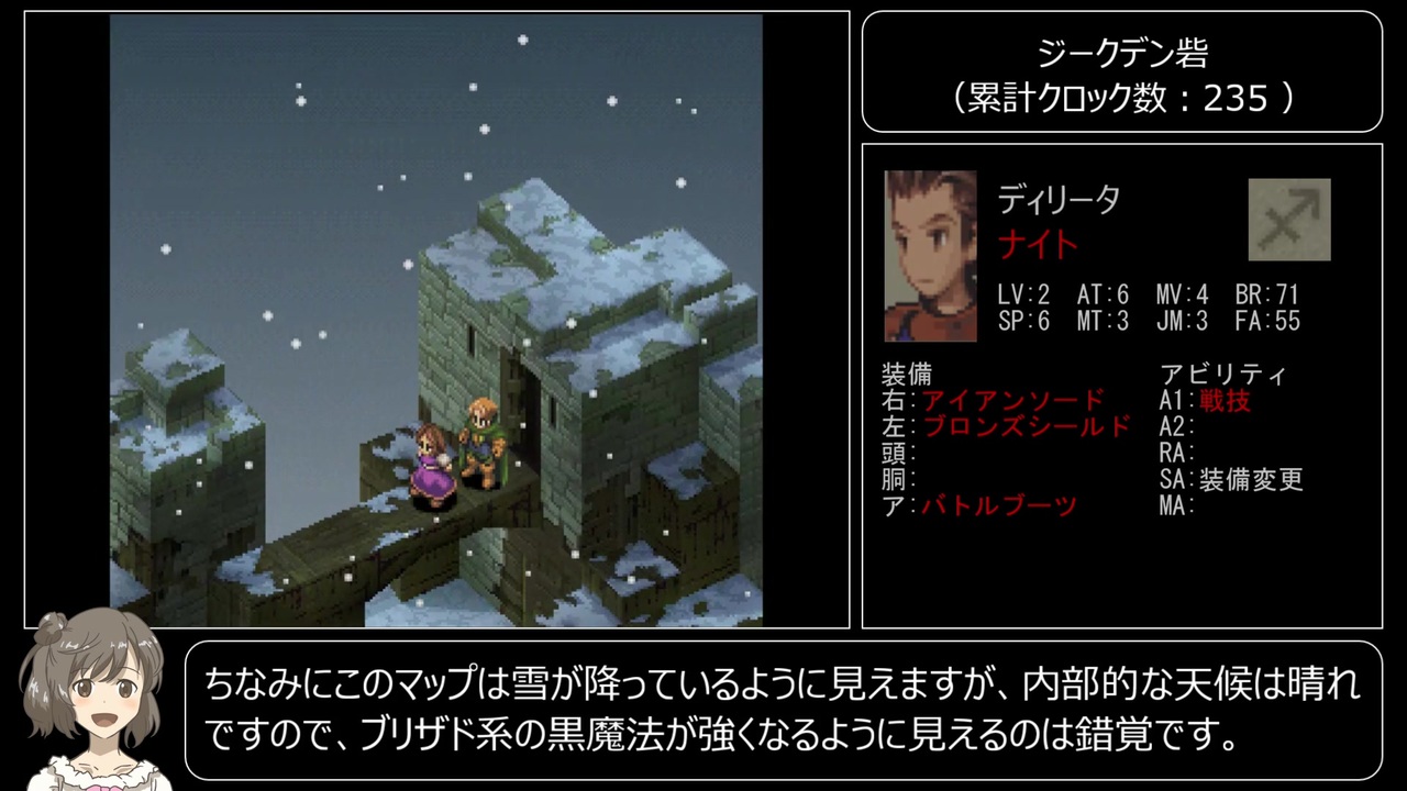 PS版FFTのシナリオを最小クロックでクリアするTAS動画です。<br>合成音声による解説がありますので、苦手な方はご注意ください。<br><br><span style="font-size: 13px;">【プレイ条件】</span><br>1. シナリオ順に戦闘を最小クロックでクリア(勝利条件を満たしたクロックまでカウント)<br>2. 移動日数の最小化(アイテム購入目的の移動は可能)<br>3. メモリーカードからのデータロード禁止<br>4. バグの利用禁止<br><br><span style="font-size: 13px;">【プレイ環境】</span><br>エミュレータ: BizHawk 2.3.1<br>最終キー入力: 1053399 F(4:56:06)<br>追記回数: 53912<br><br>プレイ条件の詳細については、Chapter1-1(<a href="https://www.nicovideo.jp/watch/sm35981364" class="watch">sm35981364</a>)の動画末尾で補足しています。<br><br><a href="https://www.nicovideo.jp/watch/sm36033252" class="watch">sm36033252</a> < 前:次 > <a href="https://www.nicovideo.jp/watch/sm36181476" class="watch">sm36181476</a><br><span style="color: #000000; font-size: 13px;">クリティカルヒットについて:</span><a href="https://www.nicovideo.jp/watch/sm36058415" class="watch">sm36058415</a><br>マイリスト:<a href="https://www.nicovideo.jp/mylist/66955206" target="_blank" rel="noopener">mylist/66955206</a>