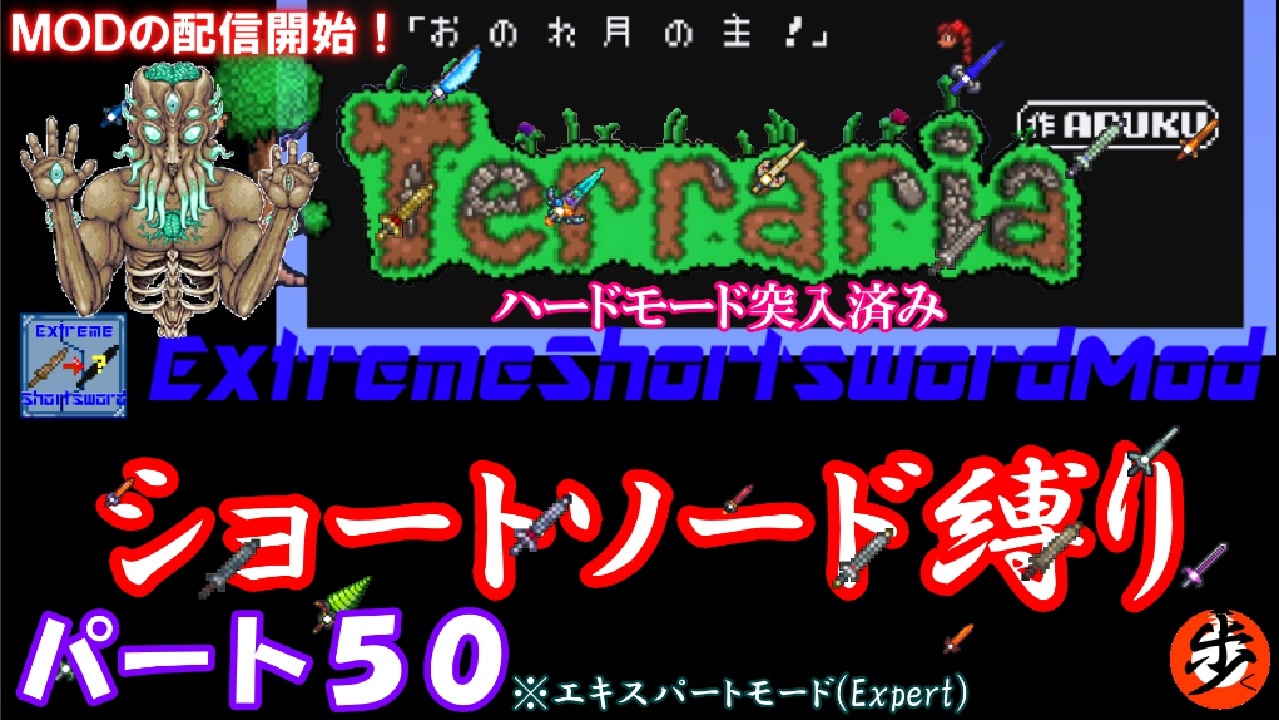 今回はついにラスボスのムーンロード戦!<br>でした・・<br><br><span style="font-size: 18px;"><strong>『Extremeshortsword』MOD公開中!</strong></span><br><strong>tModLoaderからダウンロード可能です!</strong><br><span style="font-size: 13px;"><strong>狂人用のcfモードもあるよ♪</strong></span><br><strong>(※動画内で質問やバグ等の情報は受け付けておりません!)<br><br>steamの「テラリアン・サバイバル」コミュニティ</strong><br>→<a href="https://steamcommunity.com/groups/terrarian-survival" target="_blank" rel="noopener nofollow">https://steamcommunity.com/groups/terrarian-survival</a><br><br><span style="font-size: 13px;">歩く♪のツイッター→@aruku_douga</span><br><br>ルール(特に決めていませんが一応) <br>1.ショートソード以外の武器は使用しない。(攻撃が当たらない) <br>2.ゲーム内のボスを全て倒す。(イベントや襲撃は余裕があれば) <br>3.バグ技の使用は禁止 (当たり前) <br>4.編集は頑張らない () <br><br><a href="https://www.nicovideo.jp/watch/sm36080281" class="watch">sm36080281</a>←前 次回(完結?)→<a href="https://www.nicovideo.jp/watch/sm36144464" class="watch">sm36144464</a> 12月28日(土曜日)9時公開<br>ショートソード縛りシリーズ→<a href="https://www.nicovideo.jp/series/12423" target="_blank" rel="noopener">series/12423</a><br>前シリーズ(オワタ式)シリーズ→<a href="https://www.nicovideo.jp/series/12415" target="_blank" rel="noopener">series/12415</a><br>歩くの過去シリーズ→<a href="https://www.nicovideo.jp/mylist/57583133" target="_blank" rel="noopener">mylist/57583133</a><br><br>今回のYouTube→<span style="color: #167ac6; font-size: 11px;"><a href="https://youtu.be/yGsL0fMYfdI" target="_blank" rel="noopener nofollow">https://youtu.be/yGsL0fMYfdI</a></span>