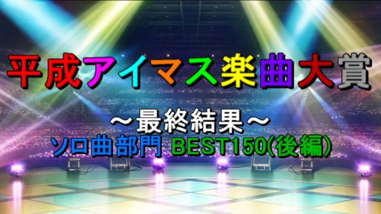 <span style="font-size: 24px;"><strong><i>『平成アイマス楽曲大賞』ここに完結です!!!</i></strong></span><br><br><span style="color: #0000ff;"><strong>平成終了(~2019/4/30)時点に音源の存在</strong></span>するアイマス関連の楽曲を対象にした<br>人気投票企画の最終結果(<span style="color: #00ffff;"><strong>ソロ曲部門編</strong></span>)です。このパートでは投票対象<br>であったソロ曲(<span style="color: #00ff00;"><strong>計442曲</strong></span>)の中から<span style="color: #ff0000;"><strong>獲得合計pt上位の50位~1位</strong></span>までを<br>ご紹介します。<br><br>★ユニット曲部門 BEST150:前編(<a href="https://www.nicovideo.jp/watch/sm36117656" class="watch">sm36117656</a>) / 後編(<a href="https://www.nicovideo.jp/watch/sm36117685" class="watch">sm36117685</a>)<br>★ソロ曲部門 BEST150:前編(<a href="https://www.nicovideo.jp/watch/sm36117697" class="watch">sm36117697</a>) / 後編(<span style="color: #ffd966;"><strong>今ココ</strong></span>)<br>★カバー曲部門 BEST70:(<a href="https://www.nicovideo.jp/watch/sm36117733" class="watch">sm36117733</a>)<br>★総合部門 BEST300:前編(<a href="https://www.nicovideo.jp/watch/sm36117760" class="watch">sm36117760</a>) / 後編(<a href="https://www.nicovideo.jp/watch/sm36117775" class="watch">sm36117775</a>)<br><br>○レギュレーション説明:<a href="https://www.nicovideo.jp/watch/sm35054161" class="watch">sm35054161</a><br>●『アイマス楽曲ランキングシリーズ』:<a href="https://www.nicovideo.jp/mylist/57911966" target="_blank" rel="noopener">mylist/57911966</a><br>●『THE IDOLM@STER Song Collection』:<a href="https://www.nicovideo.jp/mylist/61493969" target="_blank" rel="noopener">mylist/61493969</a>