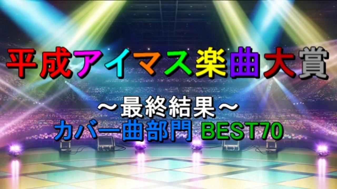 <span style="font-size: 24px;"><strong><i>『平成アイマス楽曲大賞』ここに完結です!!!</i></strong></span><br><br><span style="color: #0000ff;"><strong>平成終了(~2019/4/30)時点に音源の存在</strong></span>するアイマス関連の楽曲を対象にした<br>人気投票企画の最終結果(<span style="color: #ff9900;"><strong>カバー曲部門編</strong></span>)です。このパートでは投票対象<br>であったカバー曲(<span style="color: #00ff00;"><strong>計234曲</strong></span>)の中から<span style="color: #ff0000;"><strong>獲得合計pt上位の70位~1位</strong></span>までを<br>ご紹介します。<br><br>★ユニット曲部門 BEST150:前編(<a href="https://www.nicovideo.jp/watch/sm36117656" class="watch">sm36117656</a>) / 後編(<a href="https://www.nicovideo.jp/watch/sm36117685" class="watch">sm36117685</a>)<br>★ソロ曲部門 BEST150:前編(<a href="https://www.nicovideo.jp/watch/sm36117697" class="watch">sm36117697</a>) / 後編(<a href="https://www.nicovideo.jp/watch/sm36117717" class="watch">sm36117717</a>)<br>★カバー曲部門 BEST70:(<span style="color: #ffd966;"><strong>今ココ</strong></span>)<br>★総合部門 BEST300:前編(<a href="https://www.nicovideo.jp/watch/sm36117760" class="watch">sm36117760</a>) / 後編(<a href="https://www.nicovideo.jp/watch/sm36117775" class="watch">sm36117775</a>)<br><br>○レギュレーション説明:<a href="https://www.nicovideo.jp/watch/sm35054161" class="watch">sm35054161</a><br>●『アイマス楽曲ランキングシリーズ』:<a href="https://www.nicovideo.jp/mylist/57911966" target="_blank" rel="noopener">mylist/57911966</a><br>●『THE IDOLM@STER Song Collection』:<a href="https://www.nicovideo.jp/mylist/61493969" target="_blank" rel="noopener">mylist/61493969</a>