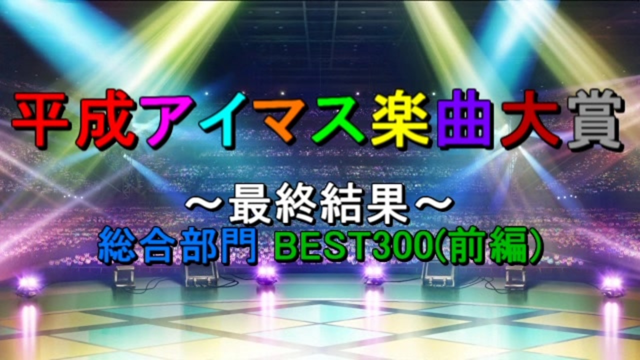<span style="font-size: 24px;"><strong><i>『平成アイマス楽曲大賞』ここに完結です!!!</i></strong></span><br><br><span style="color: #0000ff;"><strong>平成終了(~2019/4/30)時点に音源の存在</strong></span>するアイマス関連の楽曲を対象にした<br>人気投票企画の最終結果(<span style="color: #9900ff;"><strong>総合部門編</strong></span>)です。このパートでは投票対象であった<br>アイマス楽曲(<span style="color: #00ff00;"><strong>計1191曲</strong></span>)の中から<span style="color: #ff0000;"><strong>獲得票数上位の300位~101位</strong></span>までをご紹介します。<br><br>★ユニット曲部門 BEST150:前編(<a href="https://www.nicovideo.jp/watch/sm36117656" class="watch">sm36117656</a>) / 後編(<a href="https://www.nicovideo.jp/watch/sm36117685" class="watch">sm36117685</a>)<br>★ソロ曲部門 BEST150:前編(<a href="https://www.nicovideo.jp/watch/sm36117697" class="watch">sm36117697</a>) / 後編(<a href="https://www.nicovideo.jp/watch/sm36117717" class="watch">sm36117717</a>)<br>★カバー曲部門 BEST70:(<a href="https://www.nicovideo.jp/watch/sm36117733" class="watch">sm36117733</a>)<br>★総合部門 BEST300:前編(<span style="color: #ffd966;"><strong>今ココ</strong></span>) / 後編(<a href="https://www.nicovideo.jp/watch/sm36117775" class="watch">sm36117775</a>)<br><br>○レギュレーション説明:<a href="https://www.nicovideo.jp/watch/sm35054161" class="watch">sm35054161</a><br>●『アイマス楽曲ランキングシリーズ』:<a href="https://www.nicovideo.jp/mylist/57911966" target="_blank" rel="noopener">mylist/57911966</a><br>●『THE IDOLM@STER Song Collection』:<a href="https://www.nicovideo.jp/mylist/61493969" target="_blank" rel="noopener">mylist/61493969</a>