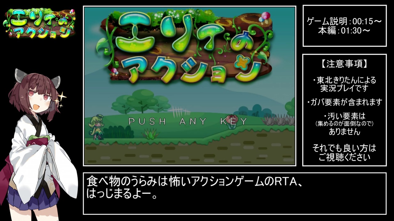 初投稿です。<br><br>インディーズゲーム「エリィのアクション」のRTA動画になります。<br>通常モードにてラスボスを討伐するまでやっていきます。<br><br>ゲーム解説は日本語版を用いていますが、実際のプレーは英語版にて行っています。<br><span style="font-size: 10px;">(コントローラーの設定がうまくいかなかったんですYURUSHITE)</span><br><br>↓ゲームの購入はこちらから↓<br>DLSite(日本語版):<a href="https://www.dlsite.com/home/work/=/product_id/RJ076858.html" target="_blank" rel="noopener nofollow">https://www.dlsite.com/home/work/=/product_id/RJ076858.html</a><br><span style="color: #b7b7b7;"><s>PLAYISM(日本語版):ttps://playism.com/ja/product/eryis-action (販売終了)</s></span><br>Steam(英語版):<a href="https://store.steampowered.com/app/261700/Eryis_Action/" target="_blank" rel="noopener nofollow">https://store.steampowered.com/app/261700/Eryis_Action/</a><br><br>追記(12/24):めっちゃ再生数増えててビビる<br>10000再生&たくさんの広告ありがとうございます!!<br>通常モードでの隠しボス出現√を走る予定は現状無いですが、代わりに隠しモードの方を今練習中です。<br>そっちの方で隠しボスも出てくるのでお楽しみに!