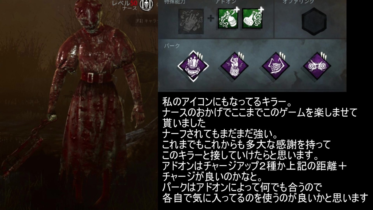 私をここまで連れてきてくれた最愛のキラー。<br>本当に2019年もナース・そしてなにより視聴者の方々にはお世話になりました!<br><br>リザルトの名前モザイクの労力削減のためにリザルト全カットしているのですがやっぱりリザルトあった方がよろしいでしょうか?<br><br>支援絵のクリップ集:<a href="https://seiga.nicovideo.jp/clip/2053472" target="_blank" rel="noopener">clip/2053472</a><br>マイリスト:<a href="https://www.nicovideo.jp/mylist/15332091" target="_blank" rel="noopener">mylist/15332091</a><br>前:<a href="https://www.nicovideo.jp/watch/sm36039948" class="watch">sm36039948</a> 後:<a href="https://www.nicovideo.jp/watch/sm36225029" class="watch">sm36225029</a><br>twitter:@Akatonbocchi<br>YouTube:<a href="https://www.youtube.com/channel/UCPGx00oc_wkUTyLzUTIqcDA" target="_blank" rel="noopener nofollow">https://www.youtube.com/channel/UCPGx00oc_wkUTyLzUTIqcDA</a><br><br>
