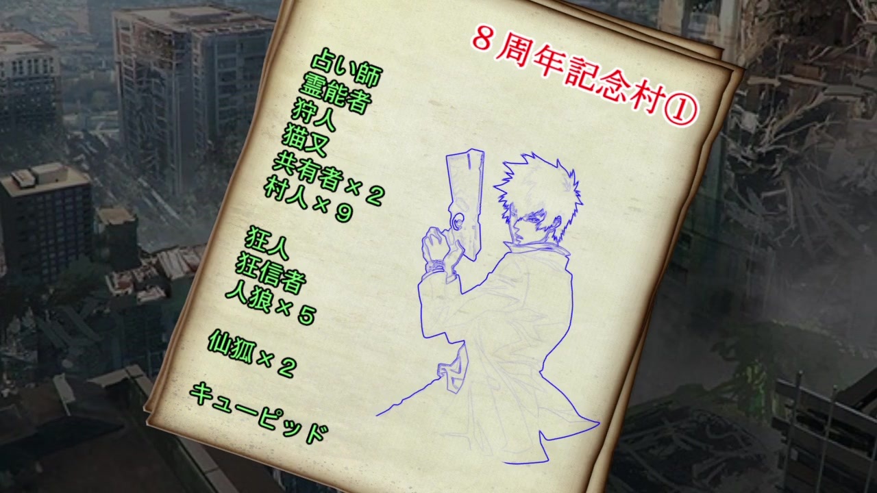 いよいよ始まります!<br>8周年記念「因縁村」<br><br>因縁のあのキャラはどのような戦いを繰り広げるのか!<br>ゴールデンボンバーの歌広場淳さんはどのような活躍を見せてくれるのか!<br>ご期待ください!<br><br>・初日犠牲者なし<br>・配役<br><span style="color: #0000ff;"> 占い師</span><span style="color: #262626; font-size: 10px;">初日占いあり</span><br><span style="color: #0000ff;"> 霊能者<br> 狩人</span><span style="color: #262626; font-size: 10px;">連続護衛あり</span><br><span style="color: #0000ff;"> 猫又</span><span style="color: #262626; font-size: 10px;">恋落ち時に相方が処刑された場合、猫又の呪い不発</span><br><span style="color: #0000ff;"> 共有者×2<br> 村人×9</span><br><span style="color: #ff0000;"> 狂人<br> 狂信者</span><span style="color: #262626; font-size: 10px;">人狼の遠吠えが聞こえる</span><br><span style="color: #ff0000;"> 人狼×5</span><br><span style="color: #38761d;"> 仙狐×2</span><span style="color: #262626; font-size: 10px;">内通あり</span><br><span style="color: #ff00ff;"> キューピッド</span><span style="color: #262626; font-size: 10px;">恋陣営死亡時に道連れで死亡</span><br><br>【Twitter】igako_jinro<br>【因縁村OP→<a href="https://www.nicovideo.jp/watch/sm36096065" class="watch">sm36096065</a>┃<a href="https://www.nicovideo.jp/mylist/67153912" target="_blank" rel="noopener">mylist/67153912</a>┃因縁村②→<a href="https://www.nicovideo.jp/watch/sm36172922" class="watch">sm36172922</a>】