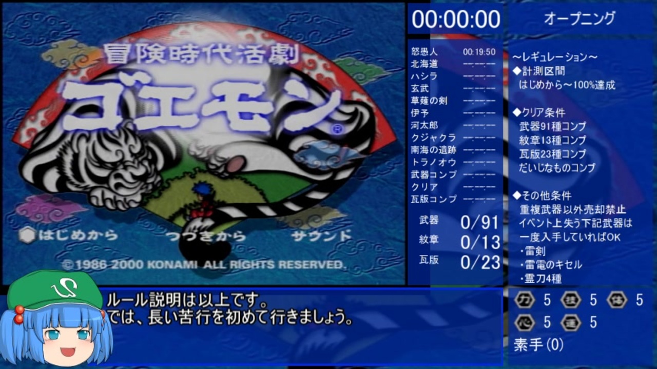 解像度を合わせて再エンコードしました。お騒がせしました…<br><br>約一年ぶりに動画をアップするモチベーションが出てきました。<br>12/29の<span style="color: #252525;">RTA in Japan 2019で冒険時代活劇ゴエモンが走られるので、その宣伝になればいいなと。</span><br><br>本記録は2019/9/29に走ったものです。<br><span style="color: #252525;">武器の解説や瓦版の読み上げをしていたら意外と説明したいことがしきれなかった…!</span><br><br><span style="color: #252525; font-size: 10px;">(ちなみに私の100%RTAベストタイムは6:55:19(</span><span style="font-size: 10px;"><a href="https://ch.nicovideo.jp/article/ar1732748" target="_blank" rel="noopener">ar1732748</a></span><span style="color: #252525; font-size: 10px;">)です)</span><br><br>活劇RTAシリーズマイリスト【<a href="https://www.nicovideo.jp/mylist/64356921" target="_blank" rel="noopener">mylist/64356921</a>】<br>次→<a href="https://www.nicovideo.jp/watch/sm36187783" class="watch">sm36187783</a><br><br>チャートはこちら【<a href="https://ch.nicovideo.jp/article/ar1816847" target="_blank" rel="noopener">ar1816847</a>】<br><br>■計測環境<br>・SCPH-50000<br>・無印版<br>・GV-USB2(パススルー接続)<br><br>■クリア条件<br>・武器、紋章、瓦版、だいじなもの(※)コンプ<br> ※宝物に表示されるものに限定<br>・重複武器以外の売却禁止<br>・ストーリー上消える武器以外は全部所持<br><br>■計測区間<br>「初めからを押した直後」から<br>「コンプ完了した時点」まで