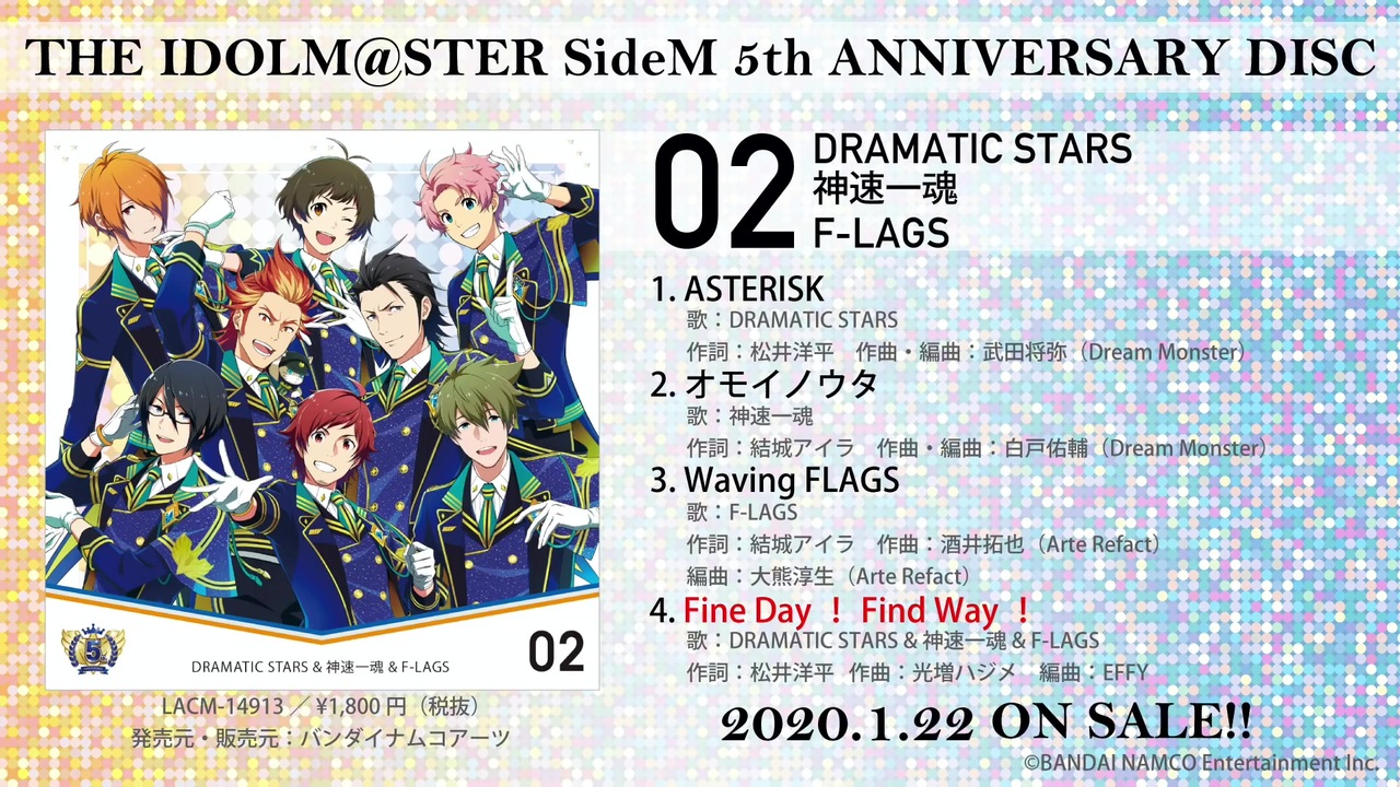 YouTube公式→<a href="https://www.youtube.com/watch?v=6gPNGdKHmDk" target="_blank" rel="noopener nofollow">https://www.youtube.com/watch?v=6gPNGdKHmDk</a><br><br><span style="color: #0d0d0d; font-size: 14px;">THE IDOLM@STER SideM 5th ANNIVERSARY DISC 02 <br>DRAMATIC STARS&神速一魂&F-LAGS<br><br>歌:DRAMATIC STARS [天道輝 (CV.仲村宗悟),桜庭薫 (CV.内田雄馬),柏木翼 (CV.八代拓)], <br>神速一魂 [紅井朱雀 (CV.益山武明), 黒野玄武 (CV.深町寿成)], <br>F-LAGS [秋月 涼 (CV.三瓶由布子), 九十九一希 (CV.徳武竜也), 兜 大吾 (CV.浦尾岳大)]<br><br>発売日:2020年1月22日(水)<br>LACM-14913/¥1,800円(税抜)<br><br>発売元・販売元:バンダイナムコアーツ<br>©BANDAI NAMCO Entertainment Inc.<br><br><br>1. ASTERISK<br> 歌:DRAMATIC STARS<br> 作詞:松井洋平 作曲・編曲:武田将弥 (Dream Monster)<br>2. オモイノウタ<br> 歌:神速一魂<br> 作詞:結城アイラ 作曲・編曲:白戸佑輔 (Dream Monster)<br>3. Waving FLAGS<br> 歌:F-LAGS<br> 作詞:結城アイラ 作曲:酒井拓也 (Arte Refact) 編曲:大熊淳生 (Arte Refact)<br>4. Fine Day! Find Way!<br> 歌:DRAMATIC STARS & 神速一魂 & F-LAGS<br> 作詞:松井洋平 作曲:光増ハジメ 編曲:EFFY</span>