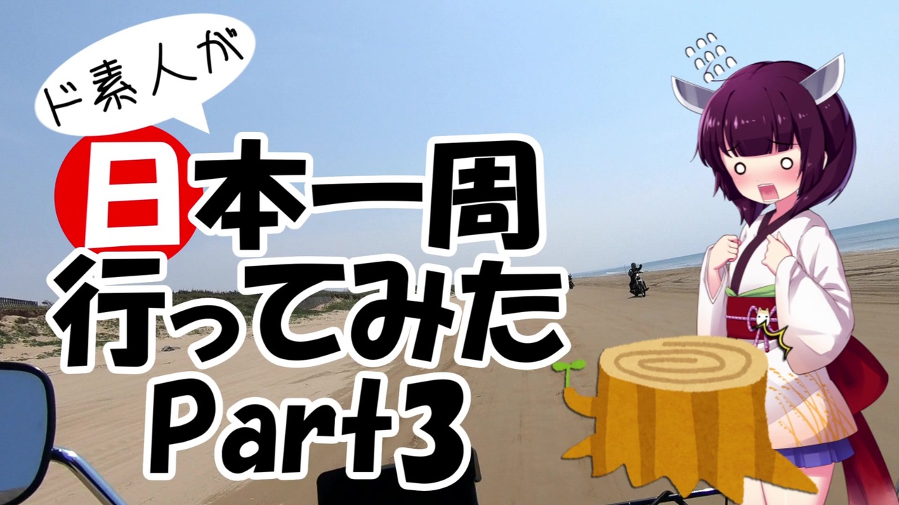 今年一年お疲れ様でした。<br>皆様はどんな年を過ごしたでしょうか?<br>私は日本一周のお蔭で楽しかったですが、その分トラブルもあった訳で・・・<br><br>ヤエーのスペル間違ってるううう!見ないでえええ!!!:( ´ཀ` ):<br><br>※1080p対応です<br><br>前→Part2【<a href="https://www.nicovideo.jp/watch/sm36080120" class="watch">sm36080120</a>】<br>次→Part4【<a href="https://www.nicovideo.jp/watch/sm36211078" class="watch">sm36211078</a>】<br><br>Part1→【<a href="https://www.nicovideo.jp/watch/sm36018324" class="watch">sm36018324</a>】<br><br>ド素人が日本一周行ってみたのマイリスト→<a href="https://www.nicovideo.jp/mylist/64280441" target="_blank" rel="noopener">mylist/64280441</a><br><br>YouTube版→<a href="https://www.youtube.com/channel/UCTsmHpxtyOEQO_tkqZ4D42A" target="_blank" rel="noopener nofollow">https://www.youtube.com/channel/UCTsmHpxtyOEQO_tkqZ4D42A</a><br><br>詳細な感想などはTwitterやブログでどうぞ。<br>Twitter:<a href="https://twitter.com/kyobon_beginner" target="_blank" rel="noopener nofollow">https://twitter.com/kyobon_beginner</a><br>ブログ:<a href="https://kyobon-beginner.hatenablog.com" target="_blank" rel="noopener nofollow">https://kyobon-beginner.hatenablog.com</a>