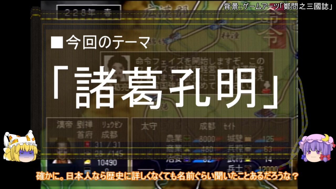 <span style="color: #0d0d0d; font-size: 14px;">北伐解説二回目は、皆大好き諸葛孔明に関する考察です。<br>今回も北伐そのもののではなく、背景の説明です。<br>※北伐自体の解説は次回からを予定しています。</span><br><br><span style="color: rgba(0, 0, 0, 0.87); font-size: 15px;">解説 :パチュリー<br>曹丕 :藍<br><br>☆参考サイト<br>■三国志、全文検索<br><a href="http://www.seisaku.bz/sangokushi.html" target="_blank" rel="noopener nofollow">http://www.seisaku.bz/sangokushi.html</a><br><br>■「出師の表」わかりやすい日本語の現代語訳 吉野 圭-Yoshino Kei<br><a href="https://ksnovel-labo.com/blog-entry-80.html" target="_blank" rel="noopener nofollow">https://ksnovel-labo.com/blog-entry-80.html</a></span><br><br>■次回<br>【ゆっくり解説】北伐に関する一考察(諸葛予告編)<br>→<a href="https://www.nicovideo.jp/watch/sm36213769" class="watch">sm36213769</a><br><br>■前回 <br>【ゆっくり解説】北伐に関する一考察(諸葛予告編)<br>→<a href="https://www.nicovideo.jp/watch/sm36152421" class="watch">sm36152421</a><br><br>■マイリスト <br>歴史に関する一考察シリーズ<br><a href="https://www.nicovideo.jp/mylist/61286226" target="_blank" rel="noopener">mylist/61286226</a> <br>■【ゆっくり解説】孫子十三篇<br><a href="https://www.nicovideo.jp/mylist/59703269" target="_blank" rel="noopener">mylist/59703269</a> <br>