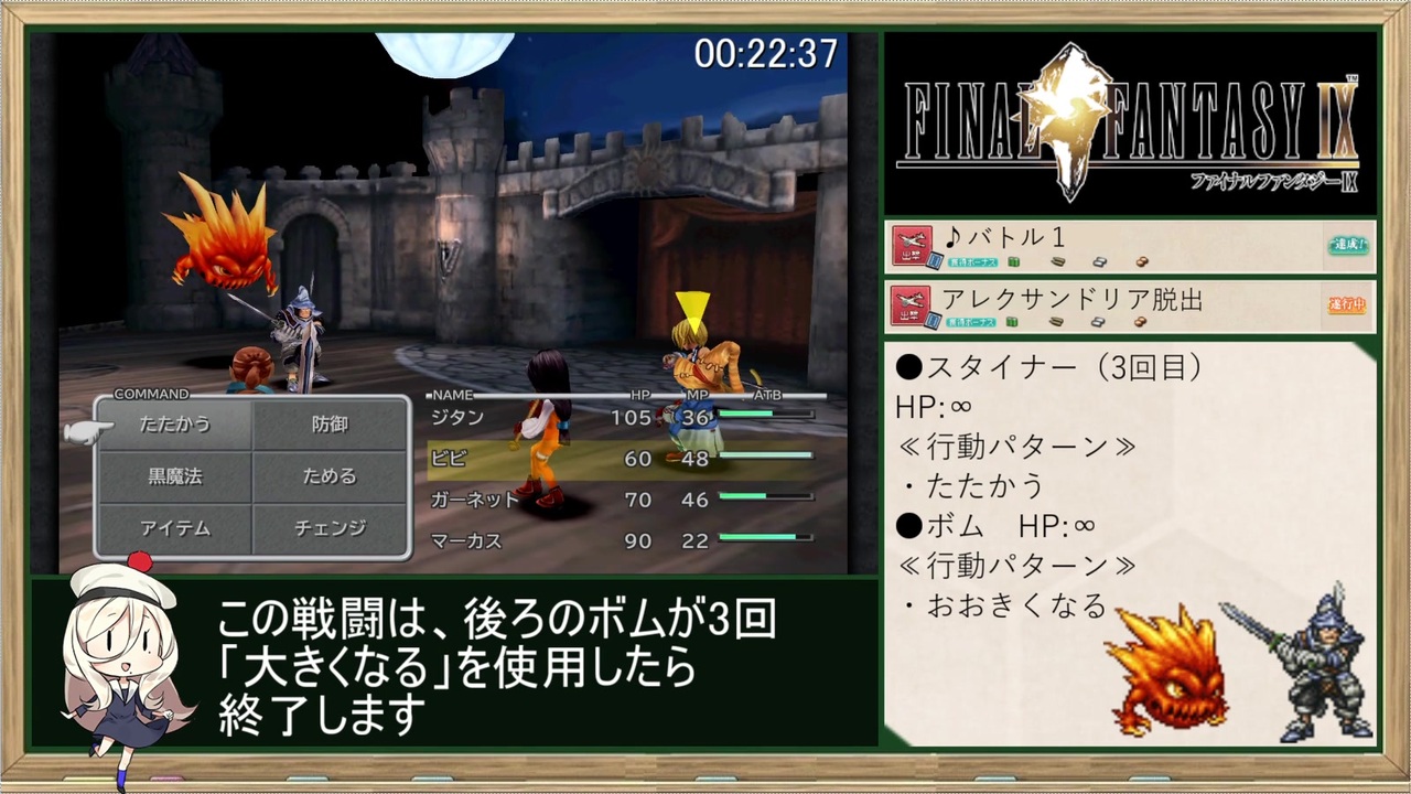 キャプテン「合言葉を言え!」<br>フリオニール「ぱんぱかぱーん」<br><br>【GAME】 <br>FINAL FANTASY Ⅸ(ファイナルファンタジー9)<br>Steam(PC版)<br><br>【レギュレーション】<br>・計測区間:NEW GAME選択~THE END表示<br>・ムービースキップ有<br>・オートセーブ使用<br>・連射コントローラ使用<br>・公式チート使用不可<br>※背景高画質化mod(Mogri mod)を導入しています<br><br>【<a href="https://www.nicovideo.jp/mylist/67167456" target="_blank" rel="noopener">mylist/67167456</a>】 <br>PREV≫<a href="https://www.nicovideo.jp/watch/sm36151772" class="watch">sm36151772</a><br>NEXT≫<a href="https://www.nicovideo.jp/watch/sm36198995" class="watch">sm36198995</a><br><br>☆こちらもどうぞ★<br>≪攻略中≫42ターンで連邦を救う戦場のヴァルキュリア4<br>≫<a href="https://www.nicovideo.jp/watch/sm35571357" class="watch">sm35571357</a><br><br>≪前作≫ドラゴンモエストⅥバーバラルートRTA_7:38:44_Part.1<br>≫<a href="https://www.nicovideo.jp/watch/sm35425017" class="watch">sm35425017</a><br><br>Other Cielo’s Title <br>【<a href="https://www.nicovideo.jp/mylist/50418741" target="_blank" rel="noopener">mylist/50418741</a> 】<br><br>twitter <a href="https://twitter.com/Cielo_Polo" target="_blank" rel="noopener nofollow">https://twitter.com/Cielo_Polo</a>