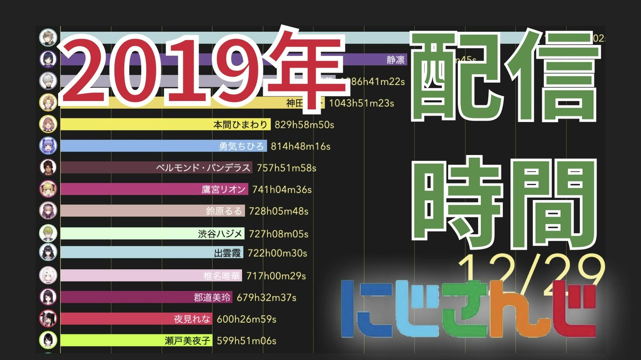 <span style="color: #0d0d0d; font-size: 14px;">2019年に行われたにじさんじライバーの配信時間をまとめました。<br>限定公開・非公開になった配信も含まれています。<br>一般公開・プレミア公開された動画は含まれません。<br>メンバー限定配信(url非公開の限定配信)も含まれません。<br>YouTube以外での配信も含まれません。</span><br><br><br>【YouTube版】<br><a href="https://youtu.be/mt9-EwjKrKQ" target="_blank" rel="noopener nofollow">https://youtu.be/mt9-EwjKrKQ</a>