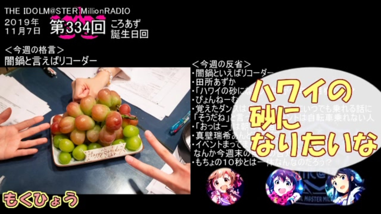アイドルマスターミリオンライブのラジオ「ミリラジ」の2019年11月放送の面白名場面まとめです。<br><br>11月はころあず誕生日回やゲスト回などで尺が長くなりすみません。<br>いつものゆるふわミリラジなのでのんびりとお聴き下さい。<br><br>またこのまとめシリーズは本家に追いつかないよう、1ヶ月以上経ったものを対象にしてますので時期がずれるのはご了承ください。<br><br>もしよろしければこちらもどうぞ<br> 【次作】12月→ <a href="https://www.nicovideo.jp/watch/sm36337452" class="watch">sm36337452</a> 【前作】10月_後編→ <a href="https://www.nicovideo.jp/watch/sm36072076" class="watch">sm36072076</a><br>その他ミリオン関連動画 → <a href="https://www.nicovideo.jp/mylist/59676609" target="_blank" rel="noopener">mylist/59676609</a><br>
