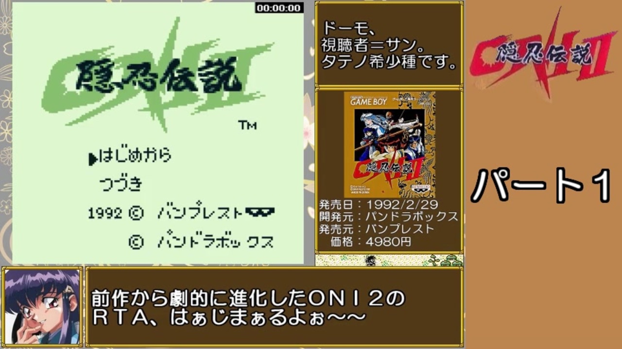 面白い…これは本当に亀に乗ったのかもしれんな…。<br><br>ルールです。<br>・「はじめから」を押してからスタート<br>・エンディング後の社名が表示されたら計測終了<br>・参考RTAです。あしからず。<br><br>はじまり~えと城到着まで<br>パート2→ <a href="https://www.nicovideo.jp/watch/sm36240678" class="watch">sm36240678</a><br><br>【参考にさせて頂いたサイト様】<br>・ゲームの里 様<br><a href="http://gesato.com/index.html" target="_blank" rel="noopener nofollow">http://gesato.com/index.html</a><br>・攻略大作戦 様<br><a href="http://way78.com/" target="_blank" rel="noopener nofollow">http://way78.com/</a><br><br>ONI RTAまとめ <a href="https://www.nicovideo.jp/mylist/64561876" target="_blank" rel="noopener">mylist/64561876</a><br><br>今までの投稿動画 <u><a href="https://www.nicovideo.jp/mylist/23798592" target="_blank" rel="noopener">mylist/23798592</a></u><br><br>Twitter→ <a href="https://twitter.com/AuraBattler777" target="_blank" rel="noopener nofollow">https://twitter.com/AuraBattler777</a>