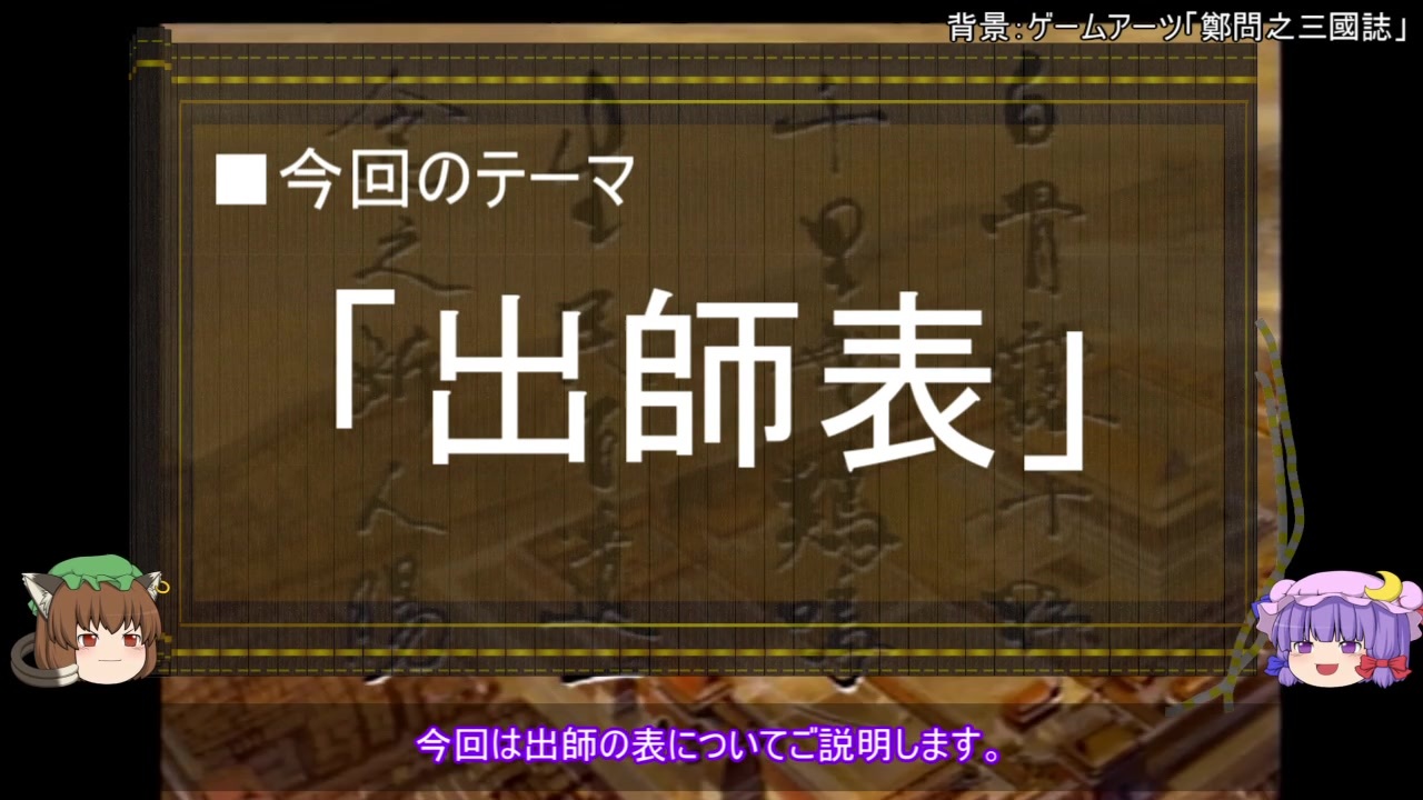 <span style="color: #0d0d0d; font-size: 14px;">北伐解説三回目は、出師表に関する考察です。<br><br>解説 :パチュリー<br>曹叡 :橙<br>諸葛亮 :映姫<br>夏侯楙 :てゐ<br><br>■次回(街亭の戦い前編)</span><br><a href="https://www.nicovideo.jp/watch/sm36334372" class="watch">sm36334372</a><br><br><span style="color: #0d0d0d; font-size: 14px;">■前回(北伐 諸葛孔明編)</span><br><a href="https://www.nicovideo.jp/watch/sm36170174" class="watch">sm36170174</a><br><br><span style="color: #0d0d0d; font-size: 14px;">☆参考サイト<br>■三国志、全文検索</span><br><a href="http://www.seisaku.bz/sangokushi.html" target="_blank" rel="noopener nofollow">http://www.seisaku.bz/sangokushi.html</a><br><br><span style="color: #0d0d0d; font-size: 14px;">■「出師の表」わかりやすい日本語の現代語訳 吉野 圭-Yoshino Kei</span><br><a href="https://ksnovel-labo.com/blog-entry-8..." target="_blank" rel="noopener nofollow">https://ksnovel-labo.com/blog-entry-8...</a><br><br><span style="color: #0d0d0d; font-size: 14px;">立ち絵:キャラ素材(きつねゆっくり) - Nicotalk &キャラ素材配布所</span><br><a href="http://www.nicotalk.com/charasozai_kt..." target="_blank" rel="noopener nofollow">http://www.nicotalk.com/charasozai_kt...</a><br><br><span style="color: #0d0d0d; font-size: 14px;">背景:鄭問之三國誌</span>