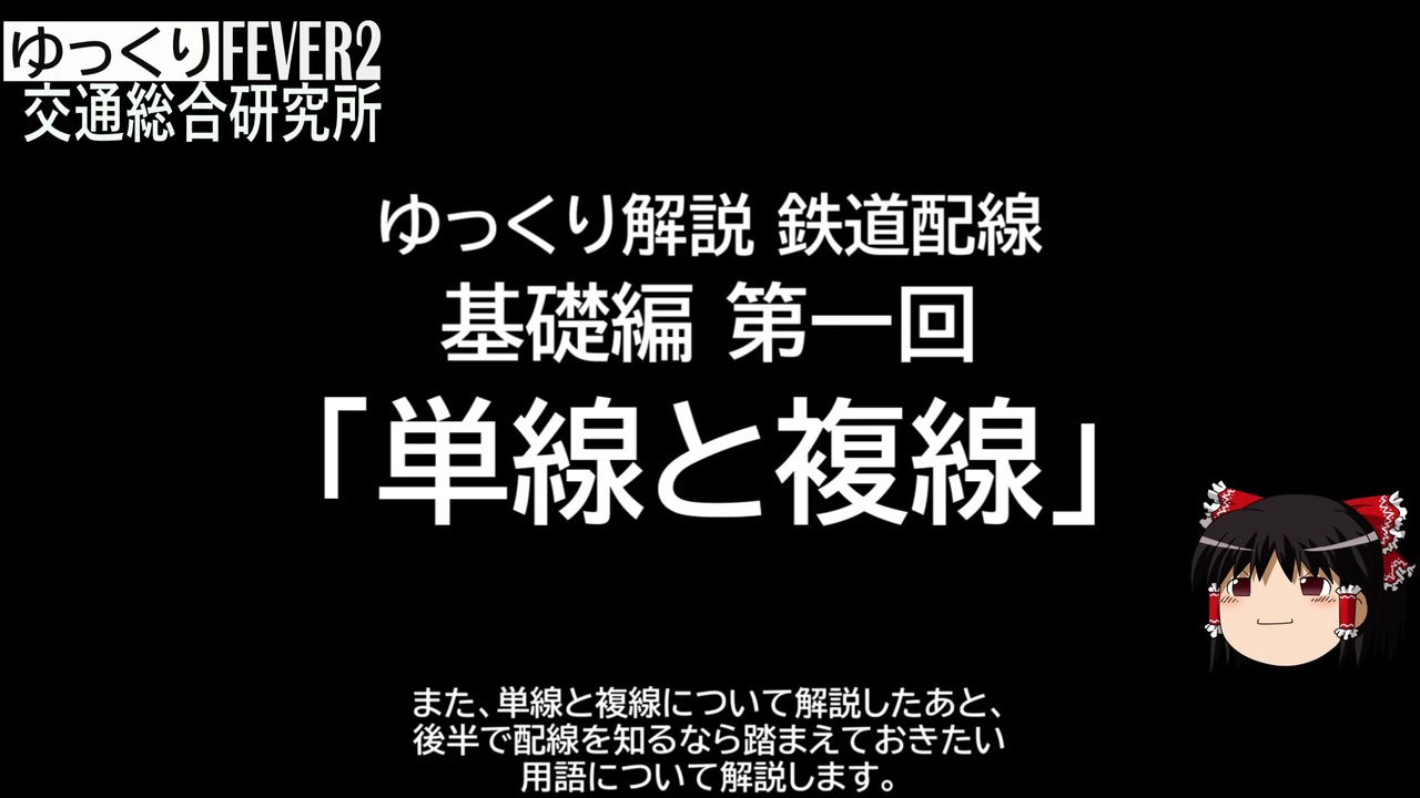 探してみると意外と無かった鉄道配線だけにフォーカスをあてる解説シリーズ。<br>基礎編は鉄道に興味を持ちはじめたばかりの方や、鉄道に興味はないけどA列車やTpFなどをより高度に遊びたい方向けです。<br><br>出資元案内<br>バンクーバー鉄道:<a href="https://www.nicovideo.jp/series/1257" target="_blank" rel="noopener">series/1257</a><br>峰幸鉄道:<a href="https://www.nicovideo.jp/series/75988" target="_blank" rel="noopener">series/75988</a><br><br>索引<br><br>【単線と複線】<br>「単線」<a href="#" class="seekTime" data-seekTime="01:28" onclick="seekNicoPlayer('#01:28'); return false;">#01:28</a><br>「複線」<span style="color: #000000; font-size: 13px;">#</span>04:01<br>「単線並列」<span style="color: #000000; font-size: 13px;">#</span>06:48<br>「双単線」<span style="color: #000000; font-size: 13px;">#</span>07:29<br> 【用語解説】<br>「配線」<span style="color: #000000; font-size: 13px;">#</span>09:00「配線略図」<span style="color: #000000; font-size: 13px;">#</span>09:27<br>「分岐器/ポイント」 <span style="color: #000000; font-size: 13px;">#</span>09:47<br>「上り/下り」 <span style="color: #000000; font-size: 13px;">#</span>11:03<br>「島式ホーム/<span style="color: #000000; font-size: 13px;">相対式ホーム</span>」<span style="color: #000000; font-size: 13px;">#</span>11:35「○面×線」<span style="color: #000000; font-size: 13px;">#</span>11:45<br>「本線と側線/<span style="color: #000000; font-size: 13px;">主本線と副本線</span>」<span style="color: #000000; font-size: 13px;">#</span>12:05<br>「中線」<span style="color: #000000; font-size: 13px;">#</span>12:38「本線と支線/幹線と枝線」<span style="color: #000000; font-size: 13px;">#</span>13:00<br>※文字数制限により索引にリンク機能はありません