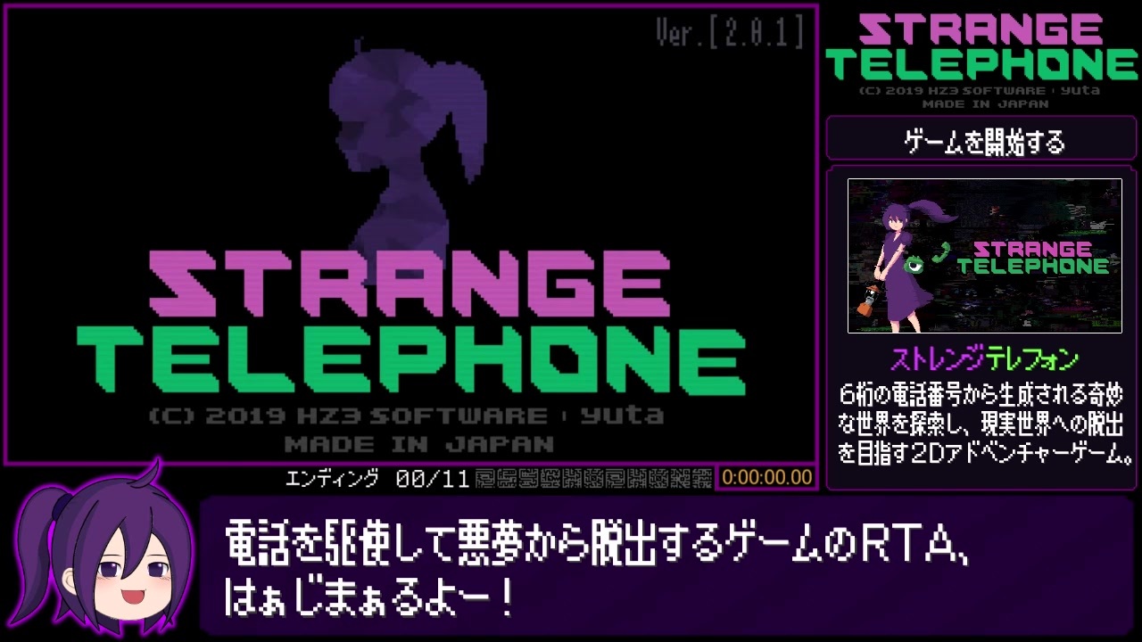 初投稿です。先日<span style="color: #3c4043; font-size: 14px;">Nintendo Switchでも配信が始まった良インディーズゲームのRTAです。<br>本作はアクションや運要素がほぼないのであまりRTA向きではないのですが、その分チャート作りがなかなか面白いです。<br><br>レギュレーションの方ですが、EDコンプリートの先駆者様がいらっしゃらなかったので勝手に決めましたごめんなさい。</span><br><br>タイムは、セーブデータがない状態でゲームを開始し『記憶を呼び覚ましますか?』ではいを押してから~EDをコンプリートしてタイトル画面が変化し、タイトルの最後の文字Eの色が変わり動きが止まった瞬間までの時間を計測。<br><br>プレイ環境は<span style="color: #3c4043; font-size: 14px;">Nintendo Switch版で、GC風のUSBコントローラーを使用してます。</span><br><br>追記:宣伝ありがとうございます。あと、編集中に気付いたんですが、実は裏技を使うと1~5桁の電話番号の世界にも行くことができます。なのでマップのパターンはもっと多かったりします。<br><br>(多分)100%版<a href="https://www.nicovideo.jp/watch/sm36399746" class="watch">sm36399746</a> <a href="https://www.nicovideo.jp/mylist/55290772" target="_blank" rel="noopener">mylist/55290772</a><br><br><br><br>