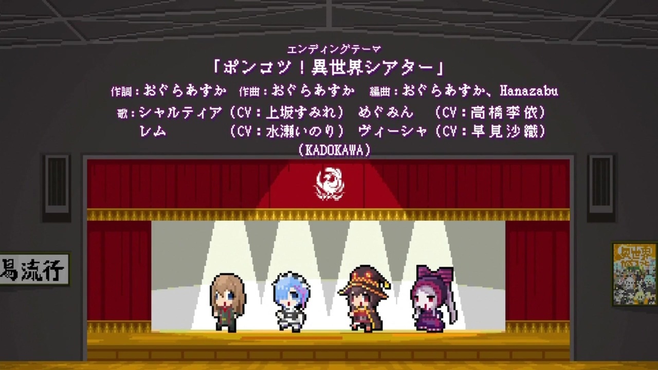 歌:シャルティア(上坂すみれ)、めぐみん(高橋李依)、レム(水瀬いのり)、ヴィーシャ(早見沙織)<br>あとエンドカードもどうぞ<br>OP <a href="https://www.nicovideo.jp/watch/sm36258939" class="watch">sm36258939</a><br>5話特殊ED <a href="https://www.nicovideo.jp/watch/sm36357162" class="watch">sm36357162</a>