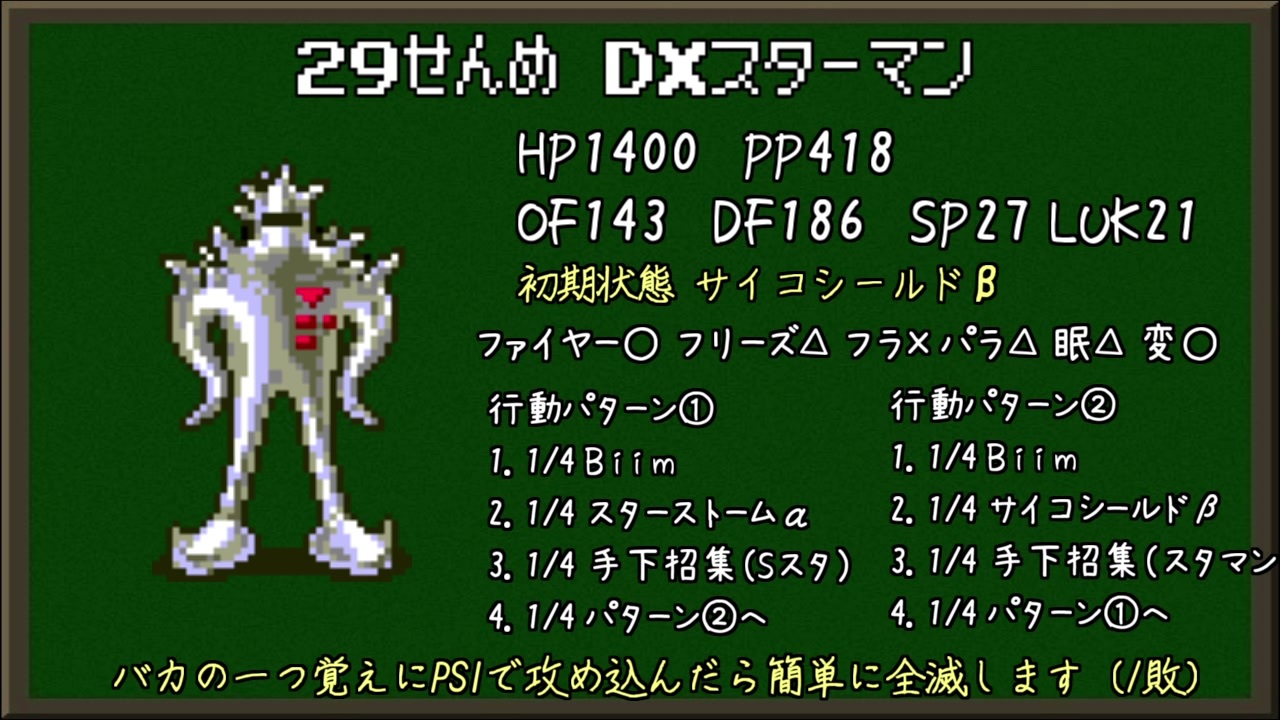 いよいよ残り4戦まで来ました。ここからは今までに一工夫してゴリ押ししていきます。<br>今回ようやく、新壁抜けを紹介できるので一安心です。<br><br><span style="font-size: 14px;">レギュレーション<br>・最</span><span style="color: #000000; font-size: 14px;">少</span><span style="font-size: 14px;">勝利回数でクリア<br>・必須戦闘以外での稼ぎ(チェック)をしない<br>・道中でのアイテム稼ぎをしない(人から貰えるアイテム、店での購入はOK)<br>・養鶏場経営(うみたてたまご錬金術)禁止 <br>・青少年危険物取扱条例に従う(ペンシルロケット及びボム、バズーカ砲も使っちゃダメ)<br>・戦闘タイミングに影響を及ぼす壁抜けバグの使用は禁止 </span><br><span style="color: #000000; font-size: 14px;">・全員生存で勝利すること<br>・実況と編集は頑張らない<br><br>前 </span><a href="https://www.nicovideo.jp/watch/sm36162383" class="watch">sm36162383</a> <span style="color: #000000; font-size: 14px;">l </span><span style="color: #006699; font-size: 14px;"><a href="https://www.nicovideo.jp/mylist/66370746" target="_blank" rel="noopener">mylist/66370746</a></span><span style="font-size: 14px;"> </span> l 次 <a href="https://www.nicovideo.jp/watch/sm36353955" class="watch">sm36353955</a><br><br><span style="font-size: 13px;">シリーズ:</span><span style="color: #006699; font-size: 13px;"><a href="https://www.nicovideo.jp/series/57539" target="_blank" rel="noopener">series/57539</a></span><br />活動内容:<a href="https://www.nicovideo.jp/mylist/18685867" target="_blank" rel="noopener">mylist/18685867</a> コミュニティ:co581190 <br><br>しぇるめでぃあ:<a href="http://shel-media.com/" target="_blank" rel="noopener nofollow">http://shel-media.com/</a><br>FANBOX:<a href="https://shel-media.fanbox.cc/" target="_blank" rel="noopener nofollow">https://shel-media.fanbox.cc/</a><br><br>twitter:<a href="https://twitter.com/Shel4869" target="_blank" rel="noopener nofollow">https://twitter.com/Shel4869</a> <br>何かあればこちらまで:doseisan.radio@gmail.com