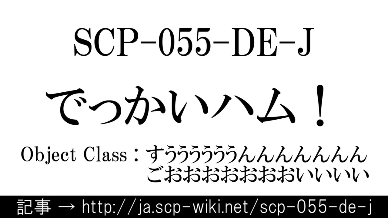 <span style="font-size: 24px;"><strong>以下の文章はなるべく広くて爆風が避けやすい場所で読む事を勧めるぜ!!</strong></span><br><span style="font-size: 18px;">Tale『でかい!!でっかいハム!!!』より抜粋したぜえええええええええええええ</span><br><br><br>初投稿でえええええええええええっっっっっっす!!!!!<br><br>オレはSCPが大好きだあああああああ!!だから動画を作っっっってみたぜええええええええええ!!今回でPart20だああああ!!<br>15秒でわかる日本昔話」風にいいいいいいいいいいいい<br>SCP-055-DE-Jを紹介すするぜええええええええええええええええ!!!!!<br><br><br>原作うううううう→ <a href="http://ja.scp-wiki.net/scp-055-de-j" target="_blank" rel="noopener nofollow">http://ja.scp-wiki.net/scp-055-de-j</a><br>著者ああああああ→ Dr Ore<br><br><br>Youtube版だああああ→ <a href="https://youtu.be/1Zc29CKXzl4" target="_blank" rel="noopener nofollow">https://youtu.be/1Zc29CKXzl4</a><br><br>前作ううううううう(地球の心臓)→ <a href="https://www.nicovideo.jp/watch/sm36215061" class="watch">sm36215061</a> 次作ううううう(SCPまとめ2)→ <a href="https://www.nicovideo.jp/watch/sm36295956" class="watch">sm36295956</a><br><br>15秒でわかるSCPマイリストォォォォォ→ <a href="https://www.nicovideo.jp/mylist/62045587" target="_blank" rel="noopener">mylist/62045587</a> ファンメイド作品マイリストォォォォォ→ <a href="https://www.nicovideo.jp/mylist/62433604" target="_blank" rel="noopener">mylist/62433604</a><br>Twitterrrrrrrrrr→ @arukano128<br><br><br>※この動画はCC BY-SA 3.0に基づき公開されまああああああああああす!!!!!