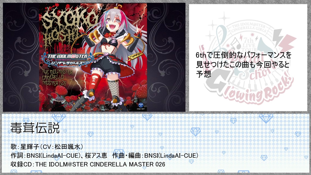 <span style="color: #000000; font-size: 14px;">皆様お疲れ様です。<br><br>この動画では2/15、2/16に行われるTHE IDOLM@STER CINDERELLA GIRLS 7thLIVE TOUR Special 3chord♪ </span>Glowing Rock! <span style="color: #000000; font-size: 14px;">で披露される楽曲を予想してみました。</span><br><br>今回はソロ曲中心に紹介しています。<br><br><span style="color: #000000; font-size: 14px;">※注意</span><br> あくまで個人の予想です。<br> 楽曲はコンセプト重視+個人的に聞きたい曲で選んでいます。ご了承ください。<br><br>ユニット曲編→<a href="https://www.nicovideo.jp/watch/sm36306315" class="watch">sm36306315</a><br><br>7th振り返り動画<br>幕張→<a href="https://www.nicovideo.jp/watch/sm35998983" class="watch">sm35998983</a><br>名古屋 day1→<span style="color: #006699; font-size: 14px;"><a href="https://www.nicovideo.jp/watch/sm35965362" class="watch">sm35965362</a></span><br> day2→<span style="color: #006699; font-size: 14px;"><a href="https://www.nicovideo.jp/watch/sm35969357" class="watch">sm35969357</a></span><br><span style="color: #262626; font-size: 14px;">大阪day1→</span><a href="https://www.nicovideo.jp/watch/sm36399966" class="watch">sm36399966</a>