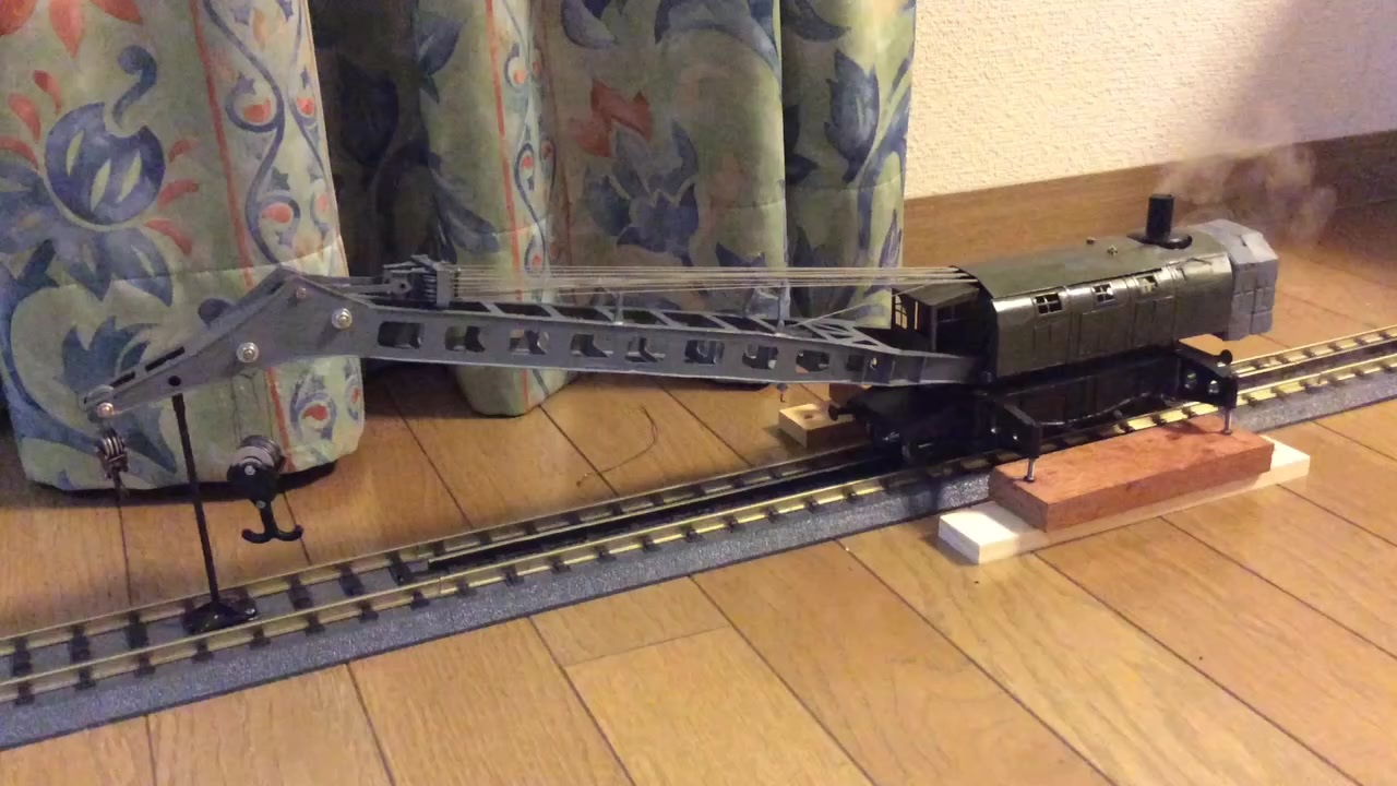 1/28追記 公式が宣伝(?)してくれたようで自分の動画とは思えないほどの再生数に驚き。<br>疑問のコメントがいくつかあったので補足します。<br>まずこれは電動です。蒸気駆動ではありません。<br>小さなギヤードモーターとギアで動かしているだけでそんな大層なものではありません。<br>蒸気エンジンは厨房のときに大火傷をして懲り懲りです。<br>エア駆動でも面白そうですがそもそもOゲージだとスペースがちょっと厳しそうです。<br>制御はDCC(デジタルコマンドコントロール)でサウンドはその機能の一つです。<br>Z21というコントローラでスマフォから操作しています。<br>レイルが3本並んでいますがこの模型は一般的な2本のレイルから集電する方式です。<br>道床のついた32mmゲージの線路はあまり無いのです。<br><br>真鍮板と一部活字合金の鋳造で作りました。かなり休みながら作って大体2ヶ月で出来ました。<br>実物と同じようにワイヤを巻き上げてブームとフックを操作します。<br>フックの滑車の回転抵抗が大きかったのでフックのワイヤはかなり省略しましたがブームのワイヤは実物通りです。<br>90tを1/45(正確には体積なので1/45^3)すると1kgですがそれを吊り上げることができます。<br>後半で吊り上げているテンダは0.9kgです。<br>デコーダーはLokSoundのたまたま余っていたN用を使っていますが一応大丈夫そうです。<br>発煙は加湿器で発煙剤はただの水道水です。<br>デコーダーの機能でサウンドと同調します。