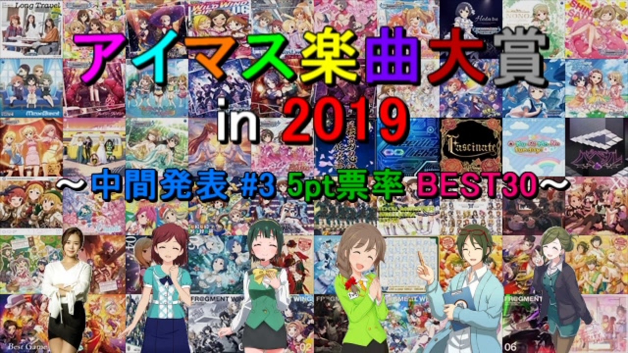 <span style="color: #ff0000;"><strong>2019年にFull音源版が発売 or 配信</strong></span>されたアイマス関連の楽曲(計78曲)に対する<br>人気投票企画の中間発表3回目です。今回は<span style="color: #0000ff;"><strong>参加者1500名</strong></span>の段階での結果を集計し、<br><span style="color: #00ff00;"><strong>5pt票率のBEST30</strong></span>を紹介します。<br><br><span style="color: #000000; font-size: 18px;"><strong>※最終結果投稿しました!!!:<a href="https://www.nicovideo.jp/watch/sm36380269" class="watch">sm36380269</a></strong></span><br><br><span style="font-size: 18px;"><strong>☆アイドルマスター楽曲メドレー【2019】:<a href="https://www.nicovideo.jp/watch/sm36271601" class="watch">sm36271601</a><br>⇒</strong></span><span style="color: #ff00ff; font-size: 18px;"><strong>頭文字P</strong></span><span style="font-size: 18px;"><strong>とのコラボ動画です。2019年の振り返りにもどうぞ。</strong></span><br><br>○告知 & 投票対象曲紹介:<a href="https://www.nicovideo.jp/watch/sm36157450" class="watch">sm36157450</a><br>○中間発表2回目:<a href="https://www.nicovideo.jp/watch/sm36230726" class="watch">sm36230726</a><br><br>【過去のアイマス楽曲大賞】<br>●2018年:<a href="https://www.nicovideo.jp/watch/sm34648255" class="watch">sm34648255</a><br>●2017年:<a href="https://www.nicovideo.jp/watch/sm32768106" class="watch">sm32768106</a><br>●2016年:<a href="https://www.nicovideo.jp/watch/sm30676427" class="watch">sm30676427</a><br>●『アイマス楽曲ランキングシリーズ』:<a href="https://www.nicovideo.jp/mylist/57911966" target="_blank" rel="noopener">mylist/57911966</a>