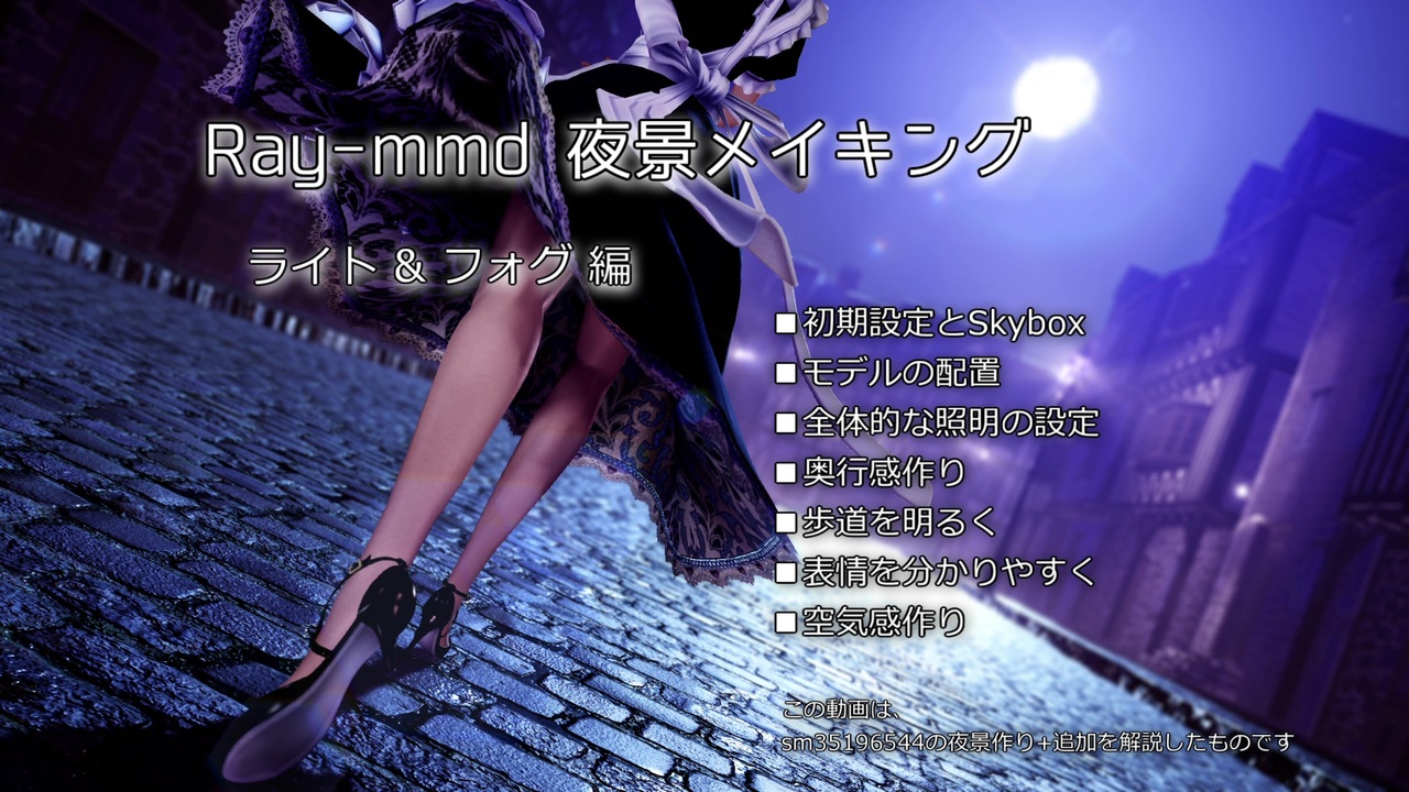 自己流ですが、<a href="https://www.nicovideo.jp/watch/sm35196544" class="watch">sm35196544</a>の夜景作りをまとめてみました。<br>リアル基調にウソ光源を盛っていきます。<br><br> <a href="#" class="seekTime" data-seekTime="00:15" onclick="seekNicoPlayer('#00:15'); return false;">#00:15</a>~ 初期設定とSkybox<br> <a href="#" class="seekTime" data-seekTime="02:03" onclick="seekNicoPlayer('#02:03'); return false;">#02:03</a>~ モデルの配置<br> <a href="#" class="seekTime" data-seekTime="04:31" onclick="seekNicoPlayer('#04:31'); return false;">#04:31</a>~ 全体的な照明の設定<br> <a href="#" class="seekTime" data-seekTime="06:15" onclick="seekNicoPlayer('#06:15'); return false;">#06:15</a>~ 奥行感作り<br> <a href="#" class="seekTime" data-seekTime="09:46" onclick="seekNicoPlayer('#09:46'); return false;">#09:46</a>~ 歩道を明るく<br> <a href="#" class="seekTime" data-seekTime="11:11" onclick="seekNicoPlayer('#11:11'); return false;">#11:11</a>~ 表情を分かりやすく<br> <a href="#" class="seekTime" data-seekTime="13:50" onclick="seekNicoPlayer('#13:50'); return false;">#13:50</a>~ 空気感作り<br><br>■後編:ディテール & 雰囲気作り(<a href="https://www.nicovideo.jp/watch/sm36292244" class="watch">sm36292244</a>)<br>■Ray-mmd 組み込みからマテリアル適用まで(<a href="https://www.nicovideo.jp/watch/sm33011150" class="watch">sm33011150</a>)<br><br>動画で使用したデータのうち、配布可能なものをパッケージ化しました。<br> <a href="https://bowlroll.net/file/216817" target="_blank" rel="noopener nofollow">https://bowlroll.net/file/216817</a><br> DLkey:making123<br><br>■Youtube版<br> <a href="https://youtu.be/237P5XZ88zE" target="_blank" rel="noopener nofollow">https://youtu.be/237P5XZ88zE</a><br><br>【レンズフレア解説について】<br> 誤解を招く解説になってしまい申し訳ありません。<br> 月光のレンズフレアはテンプレを使った自作なのでRay-mmdには含まれていません。<br> 太陽のレンズフレアを調整しても同じような結果になります。<br><br> Ver1.5.2にはレンズフレアそのものが含まれていませんので、<br> ひとつの解決策(旧版からのコピー)のお知らせが解説の主旨となっています。<br><br>タグはつけないでください。よろしくお願いします。